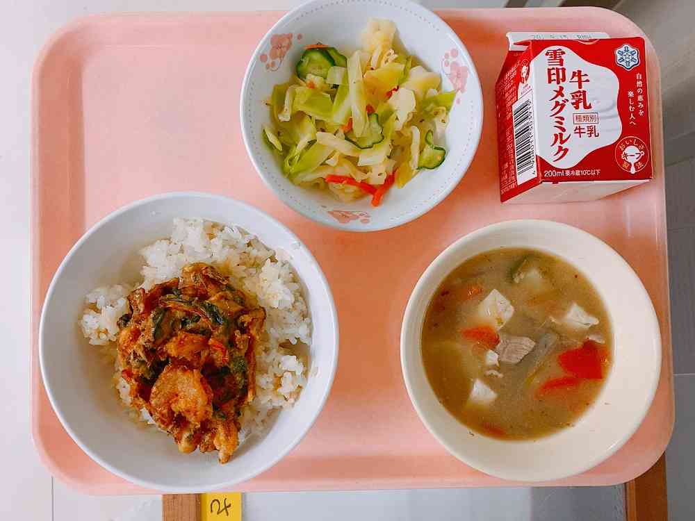 かき揚げ丼、キャベツのかおり漬け、豚汁