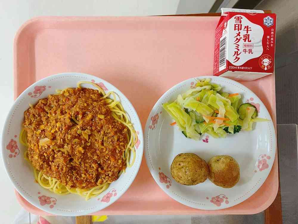 ミートビーンズスパゲッティー、ローストポテト、ブロッコリー入りサラダ