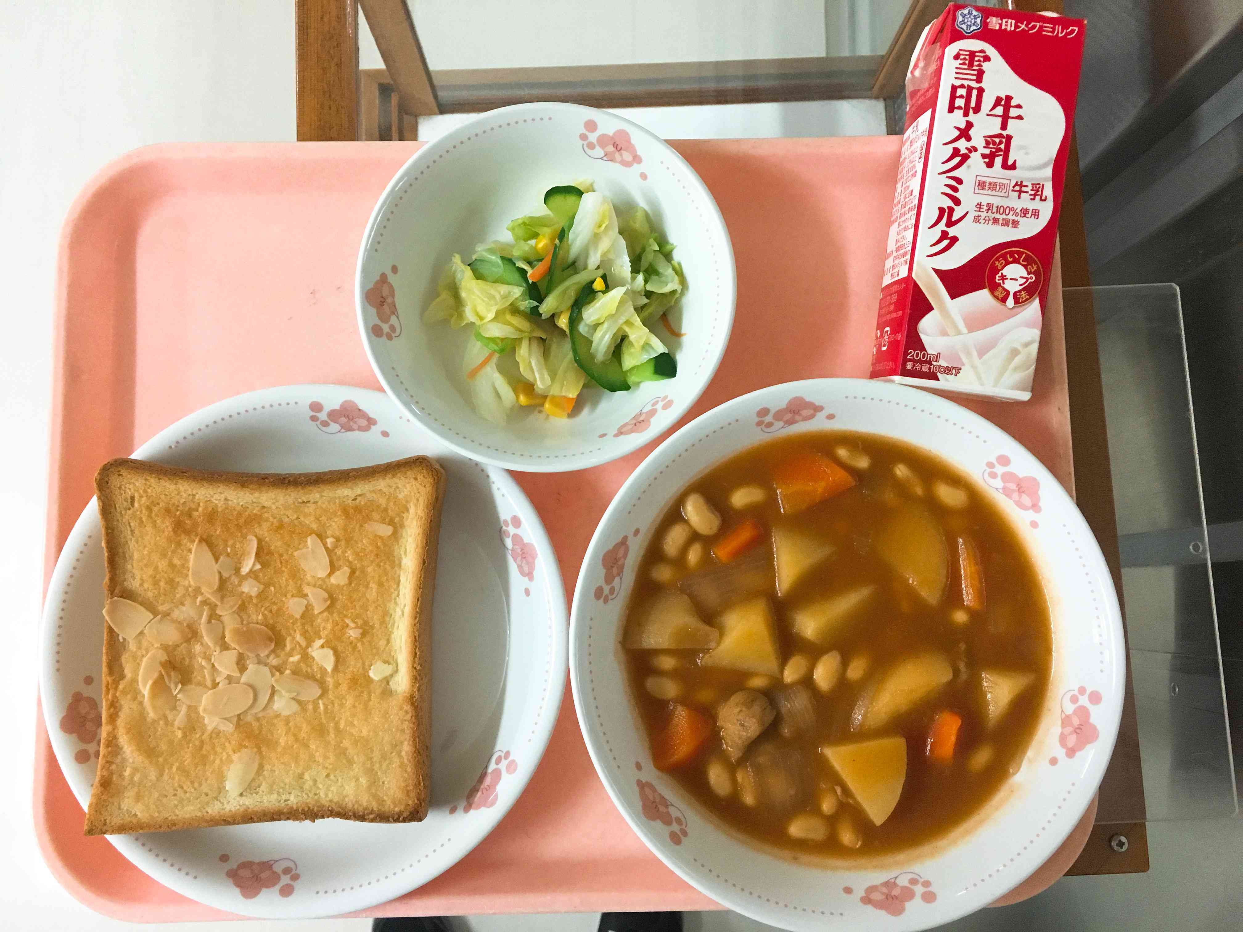 アーモンドトースト、米粉のチキンビーンズ、コーン入りサラダ