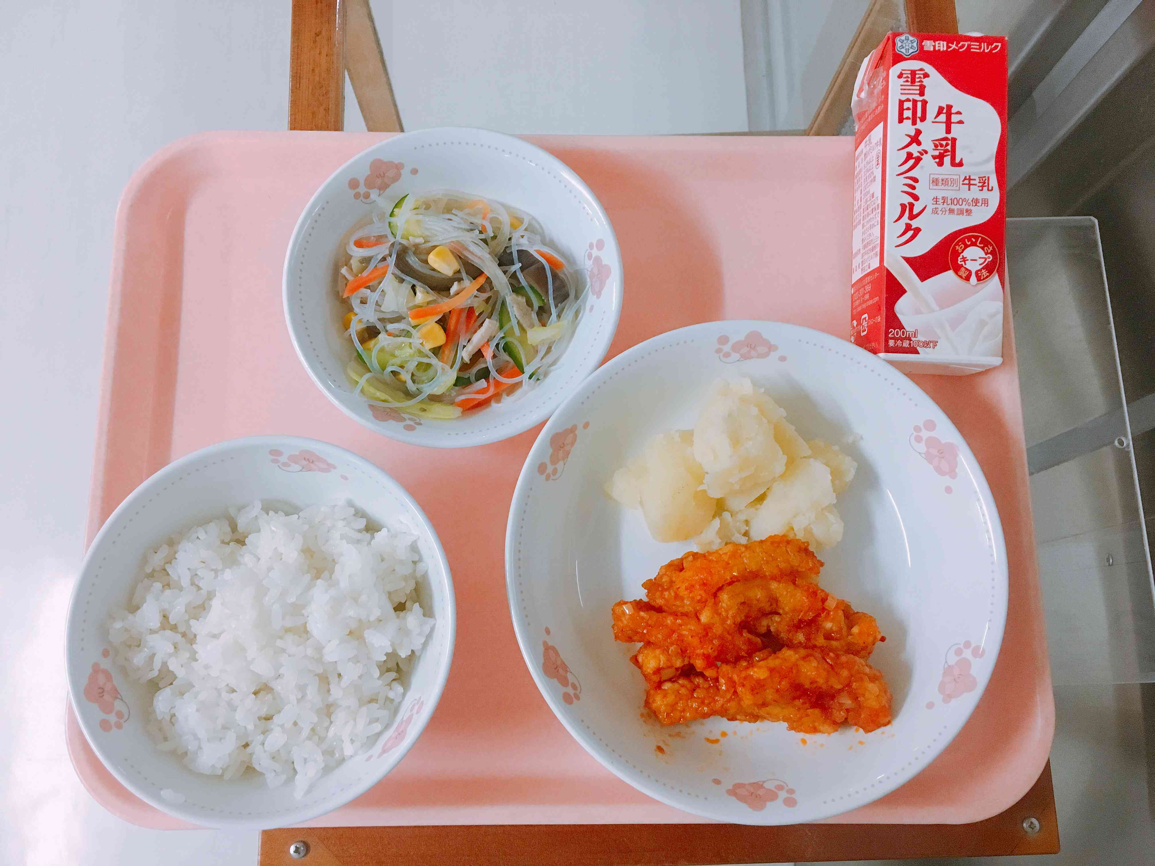 ごはん、いかのチリソース、粉ふきいも、朝に食べたい春雨サラダ