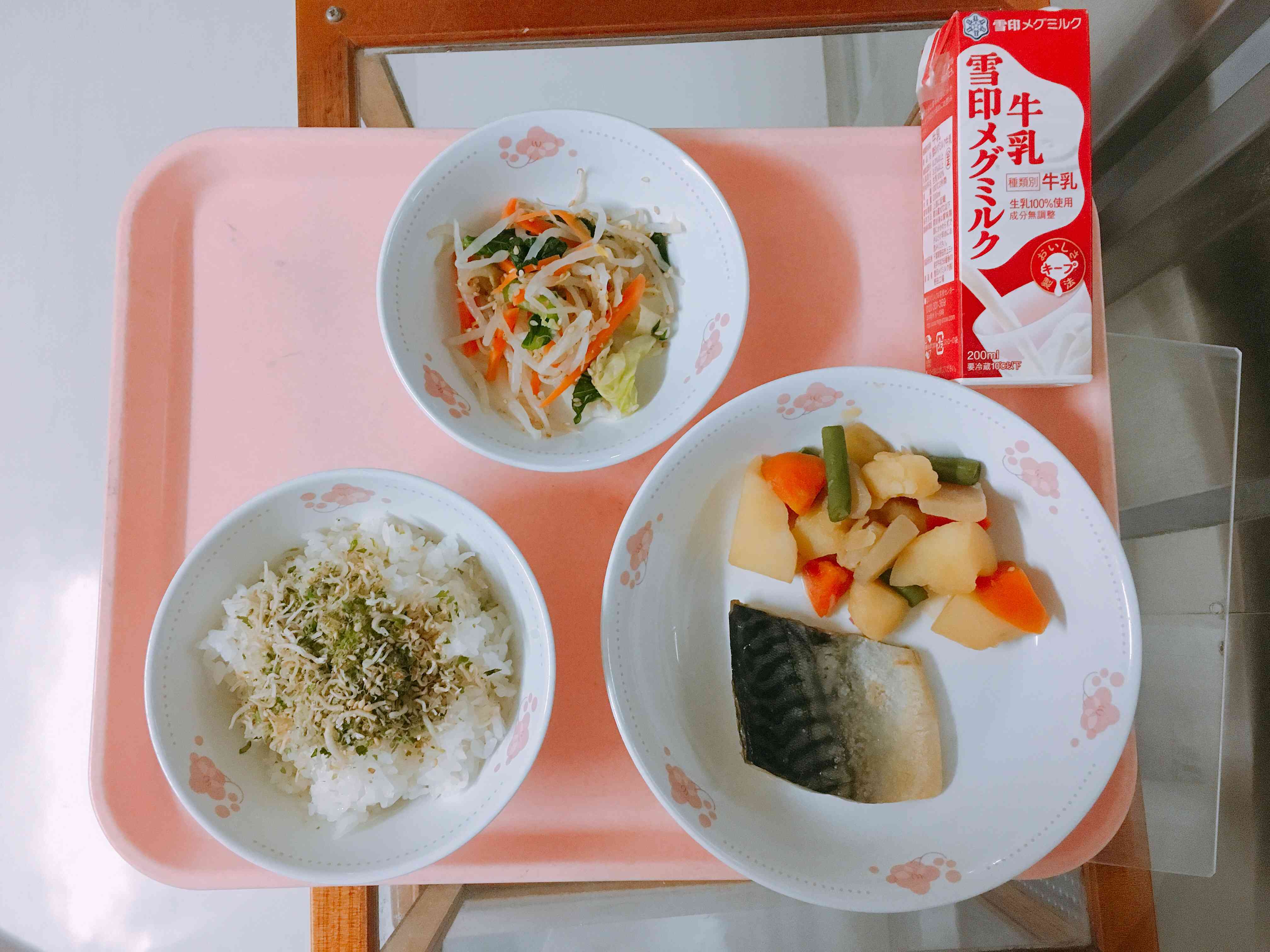 ごはん、じゃこふりかけ、さばの塩焼き、じゃがいもの煮物、小松菜の和え物