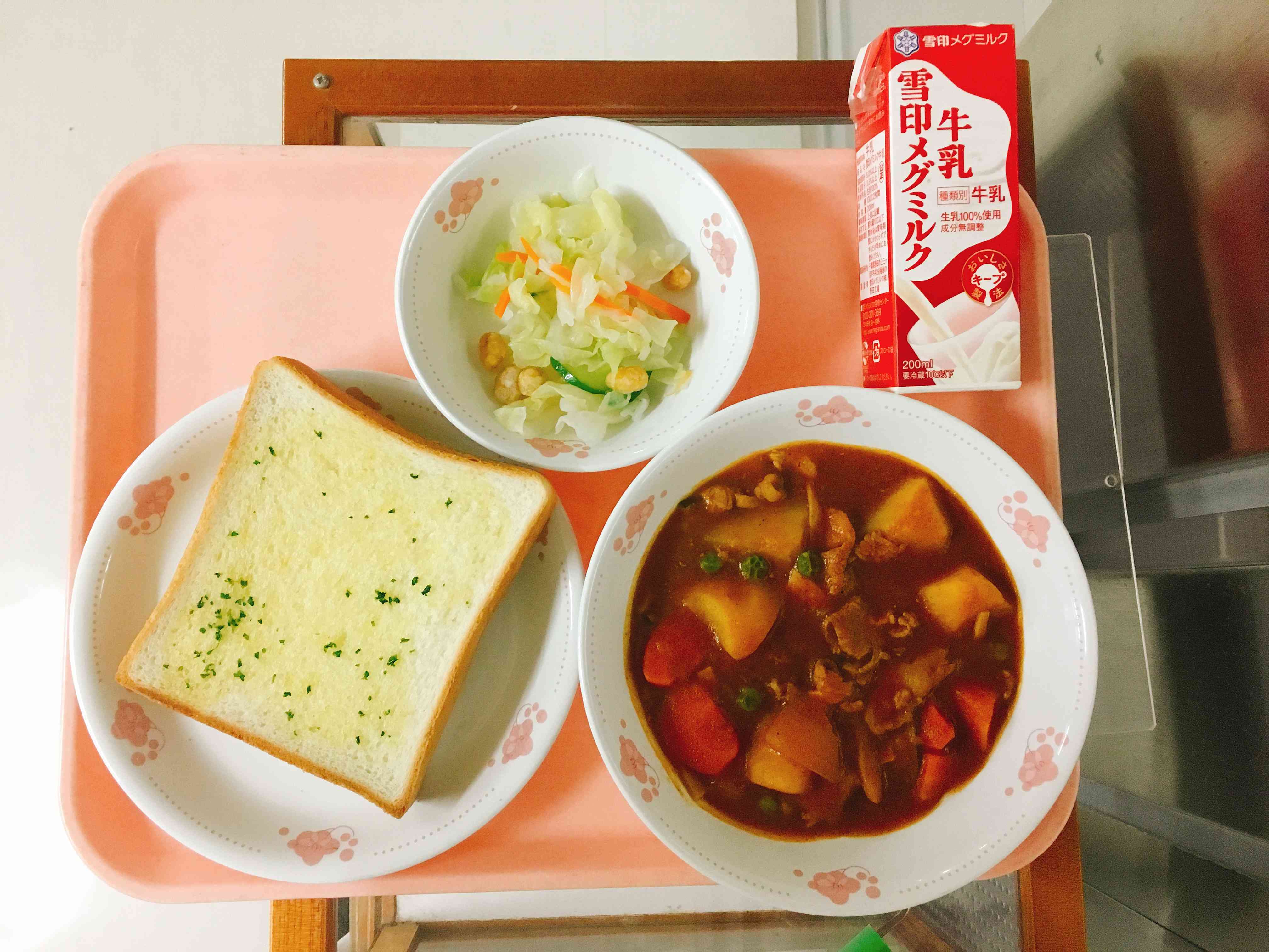 ガーリックトースト、ポークシチュー、ドレッシングサラダ