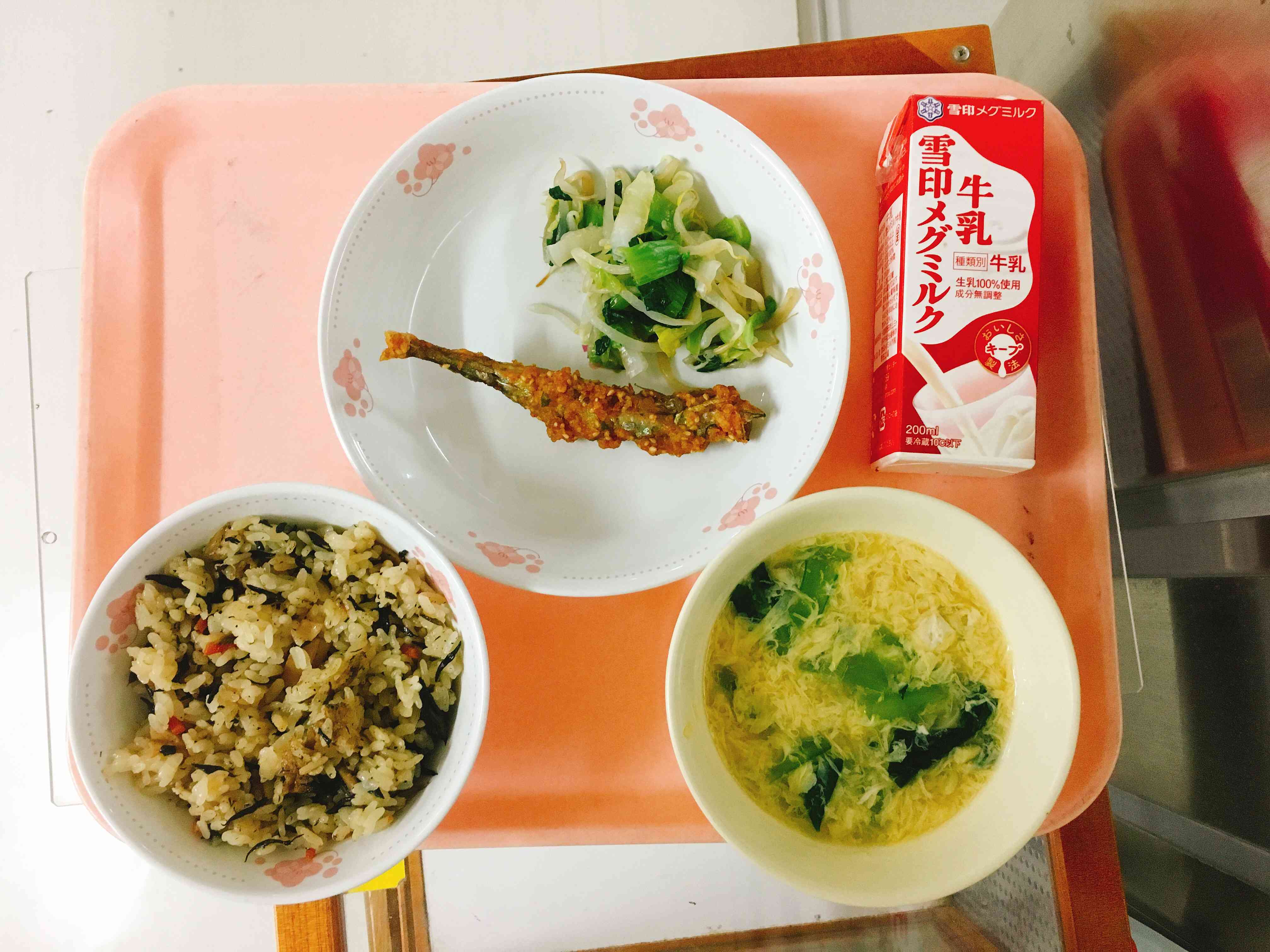ひじき入り五目ごはん、ししゃもの香味揚げ、おひたし(辛子醤油)、かきたま汁
