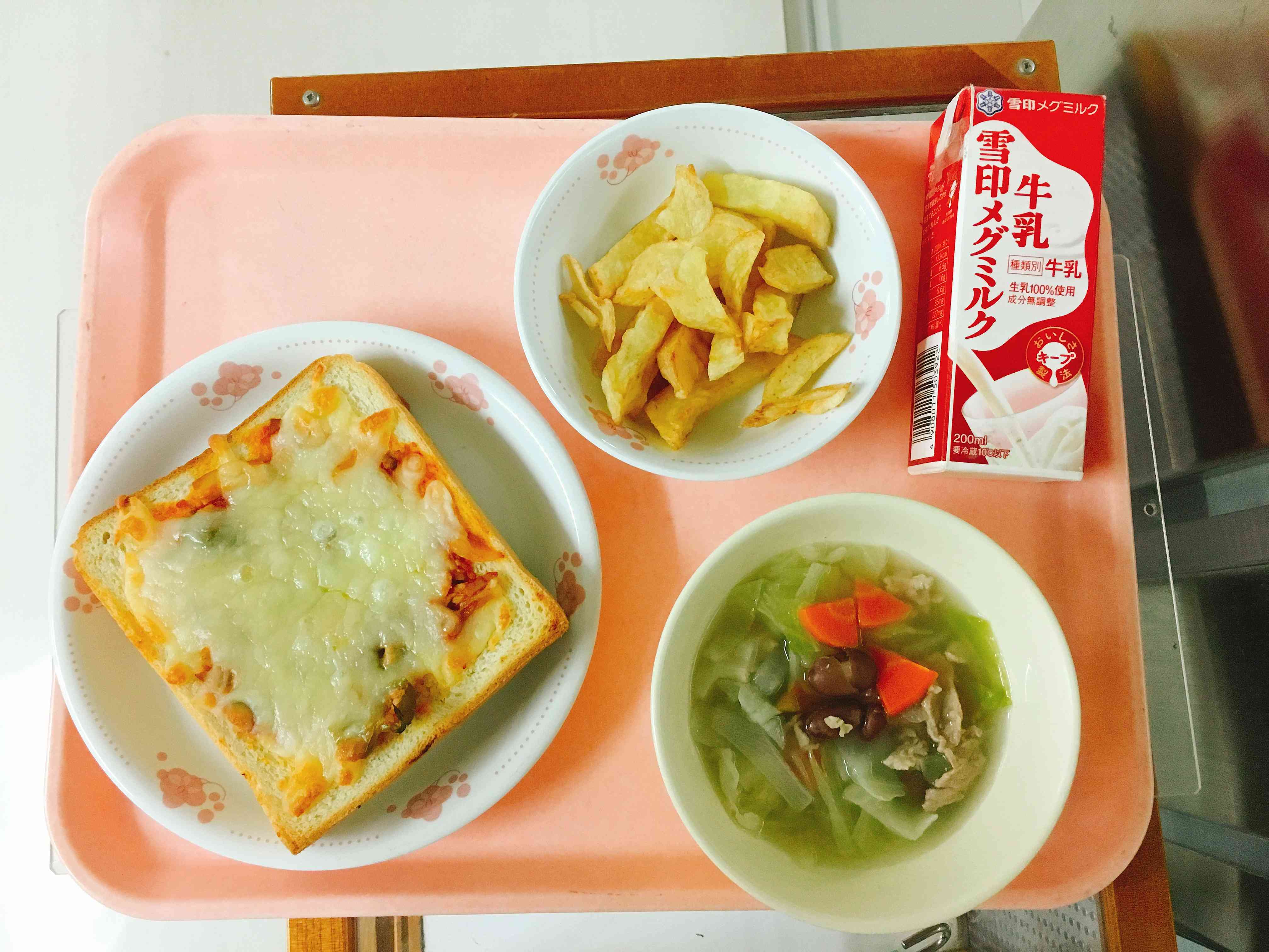 ピザトースト、豆入り野菜スープ、フライドポテト