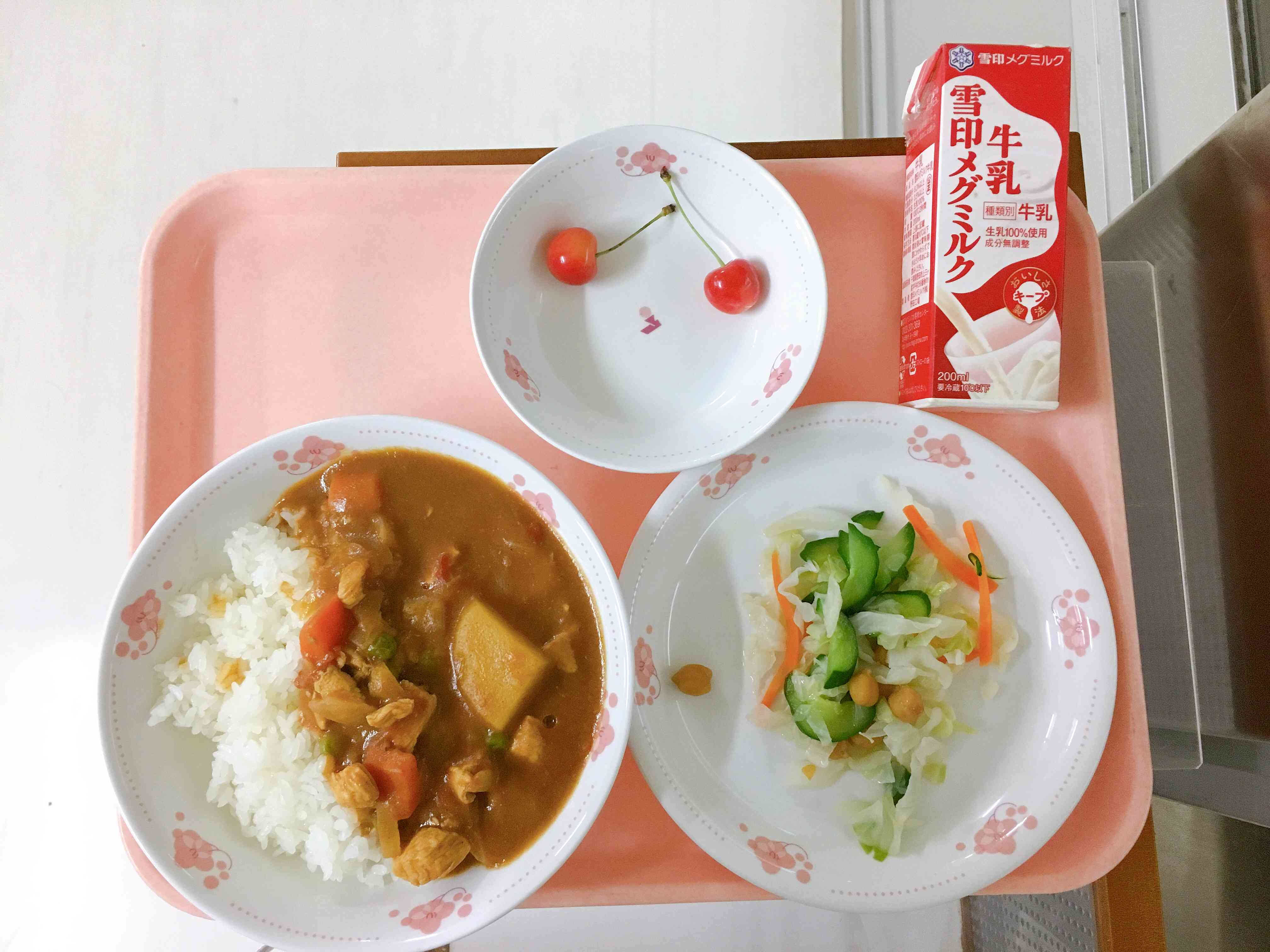 チキンカレーライス、ひよこ豆入りサラダ、さくらんぼ