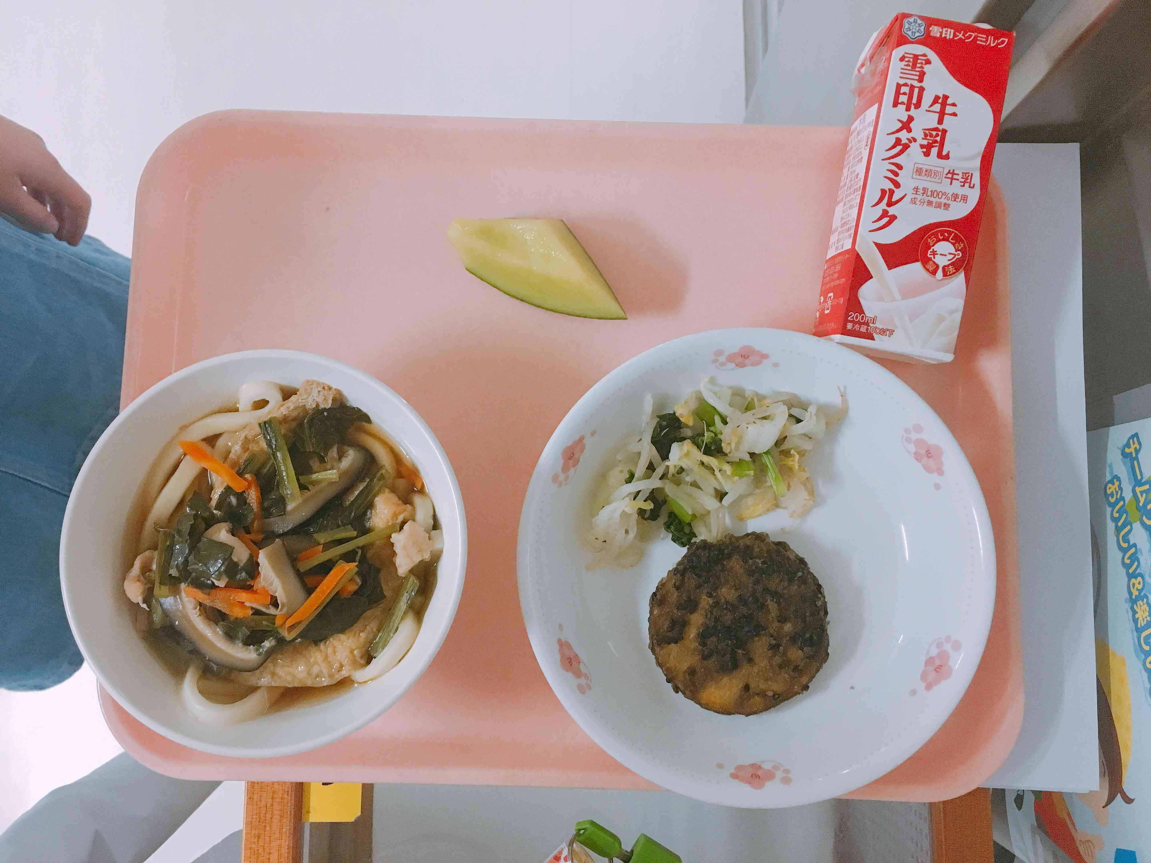 きつねうどん、さつまいものごま天ぷら、おひたし(土佐醤油)、メロン