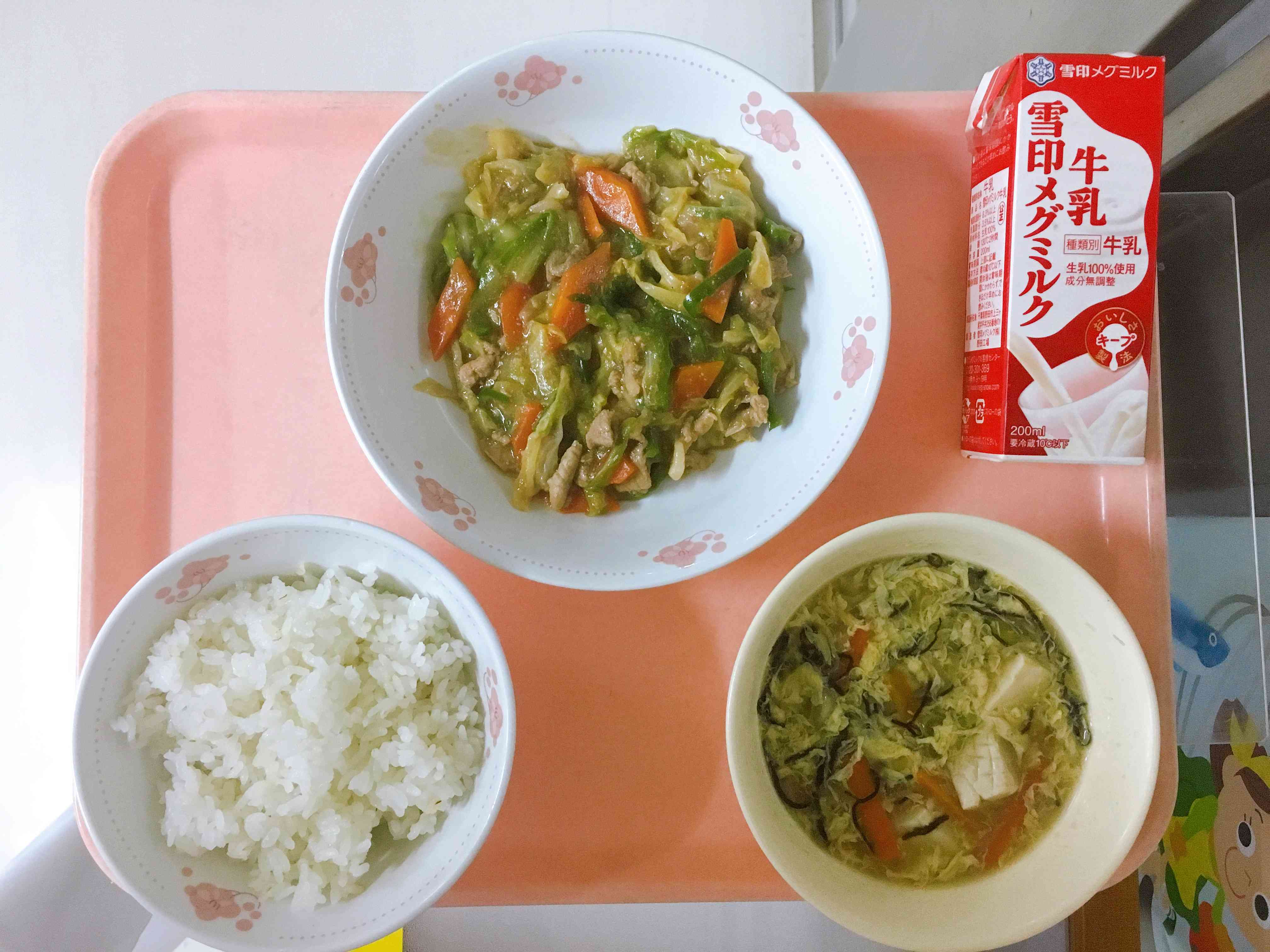 ごはん、回鍋肉、もずくと卵のスープ