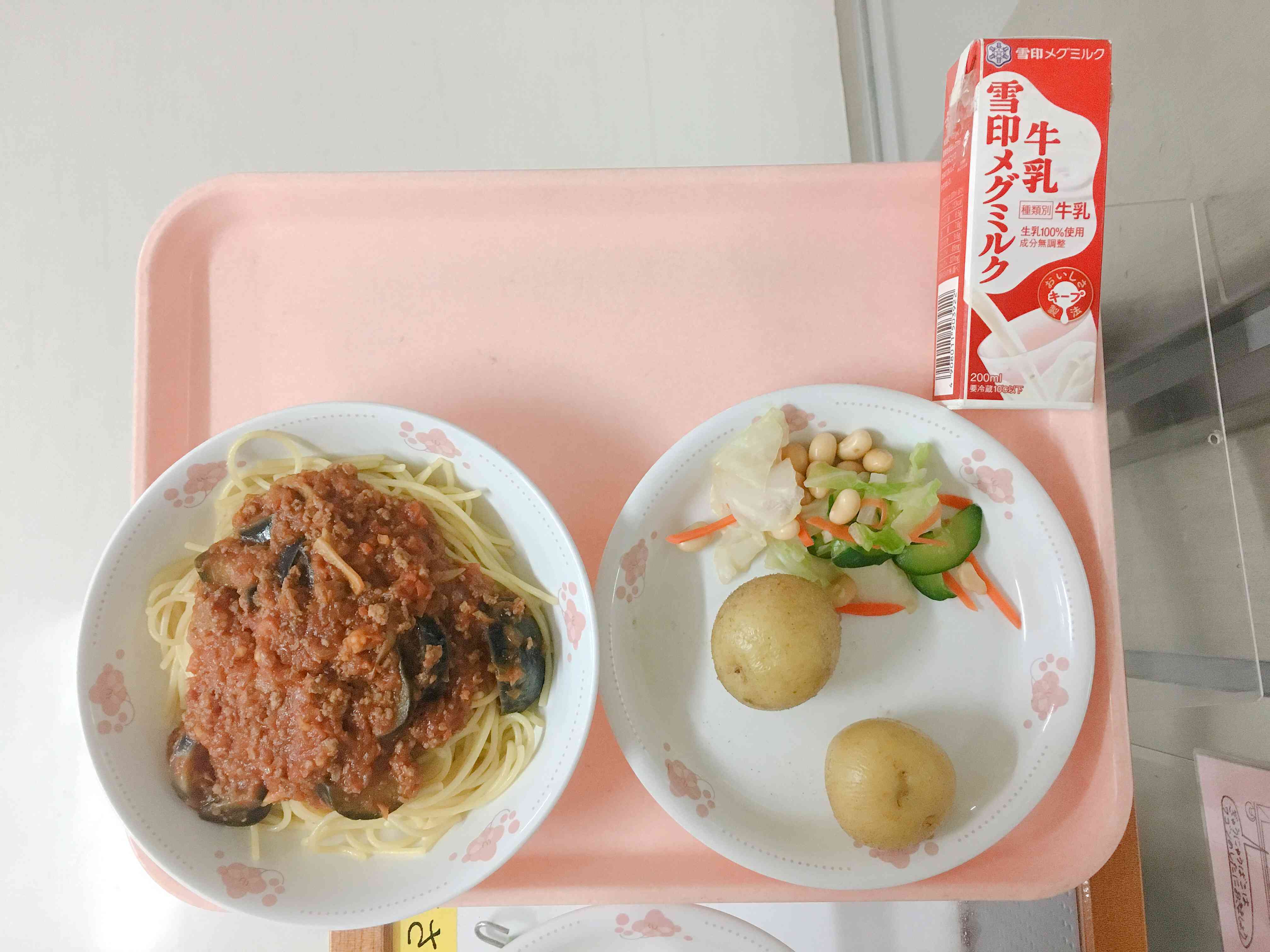 なす入りミートソーススパゲッティー、大豆入りサラダ、ローストポテト