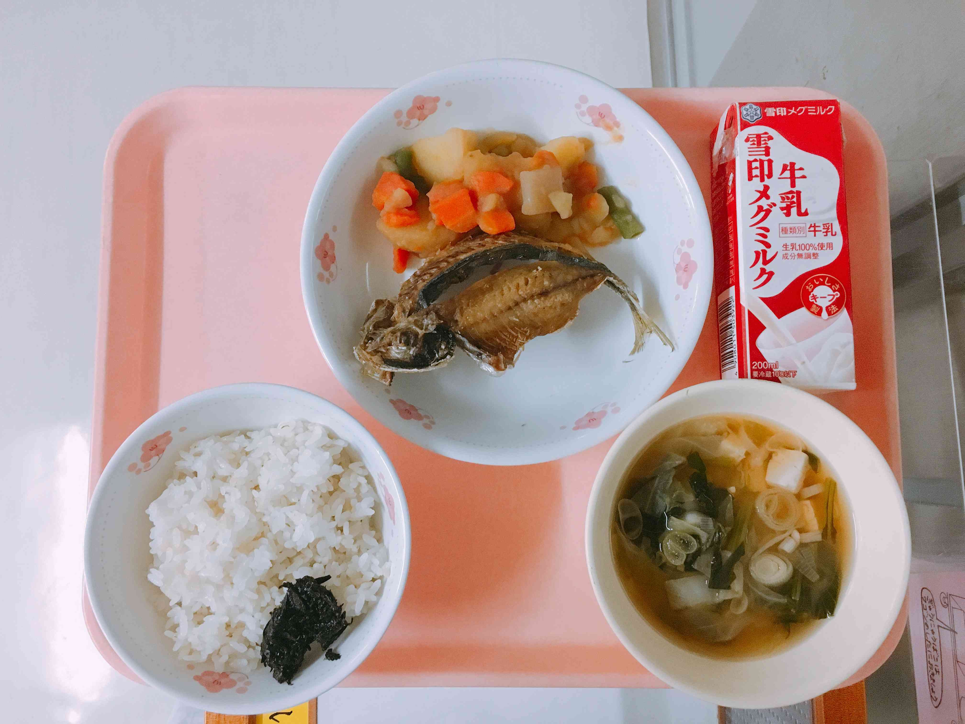 ごはん、ひじき入りのりの佃煮、あじの干物のから揚げ、じゃがいもの煮物、えのきのみそ汁