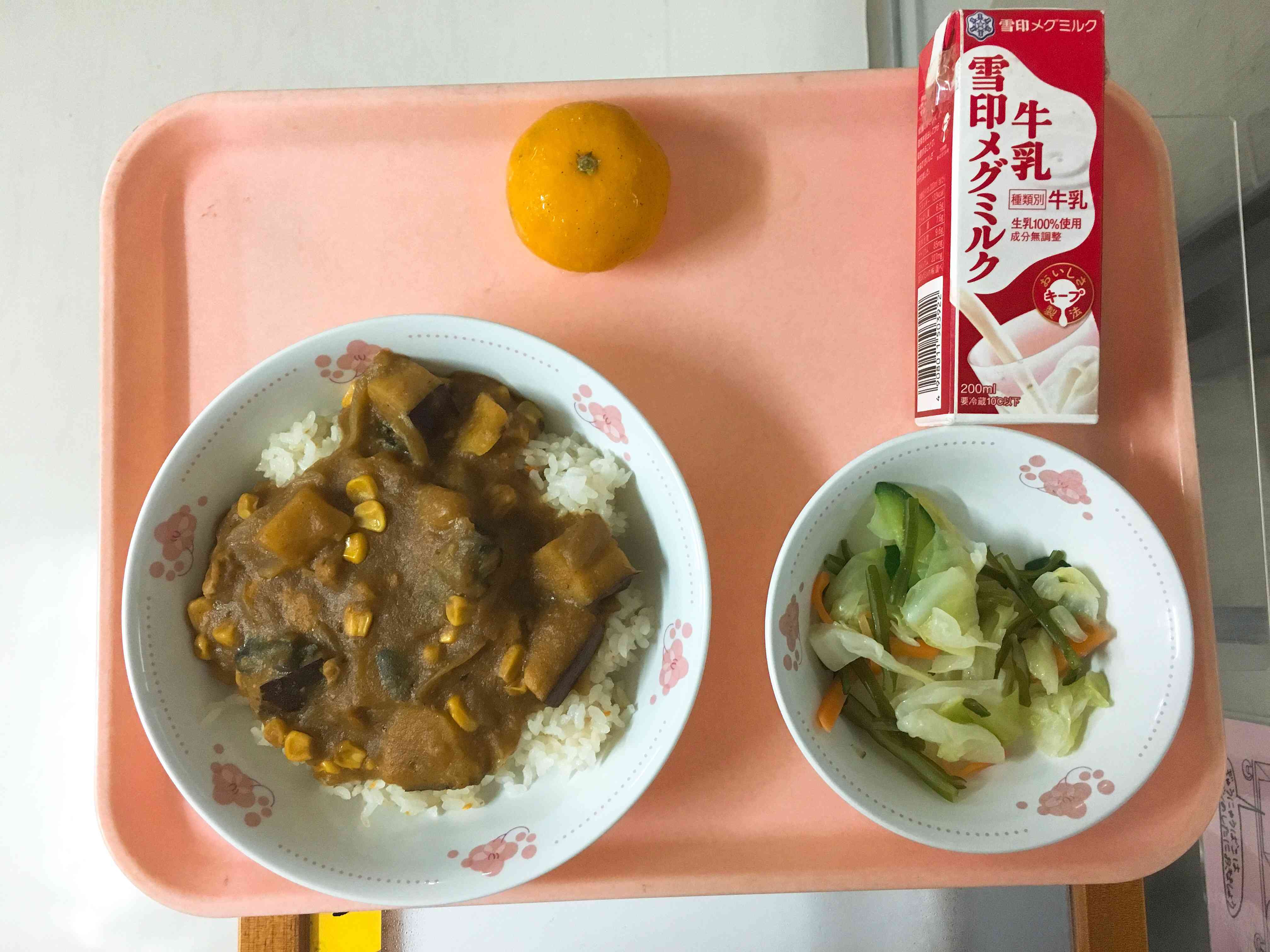 給食委員の令和カレーライス、海藻入りサラダ、冷凍みかん
