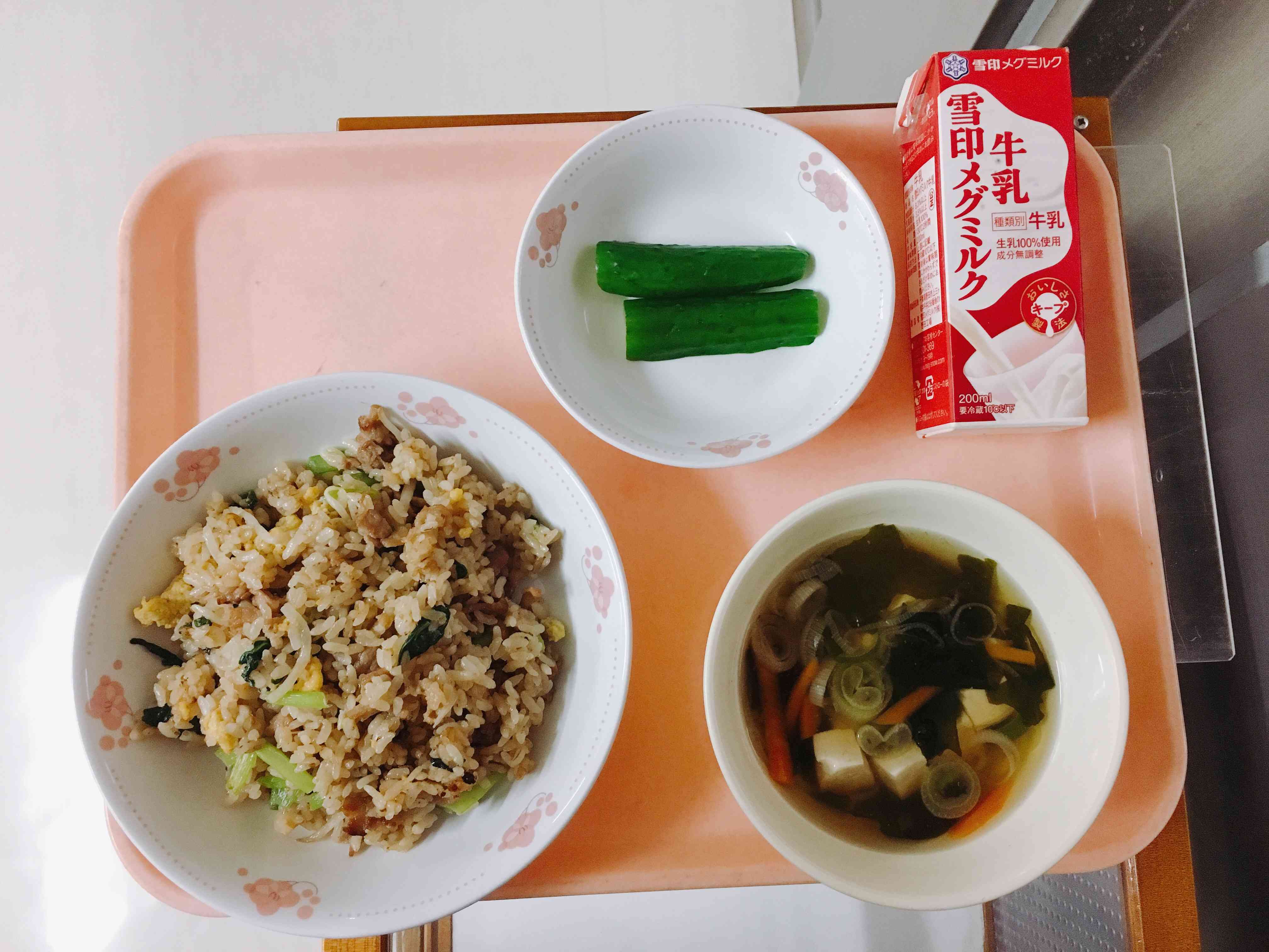 ビビンバ炒飯、舟きゅうり、わかめスープ