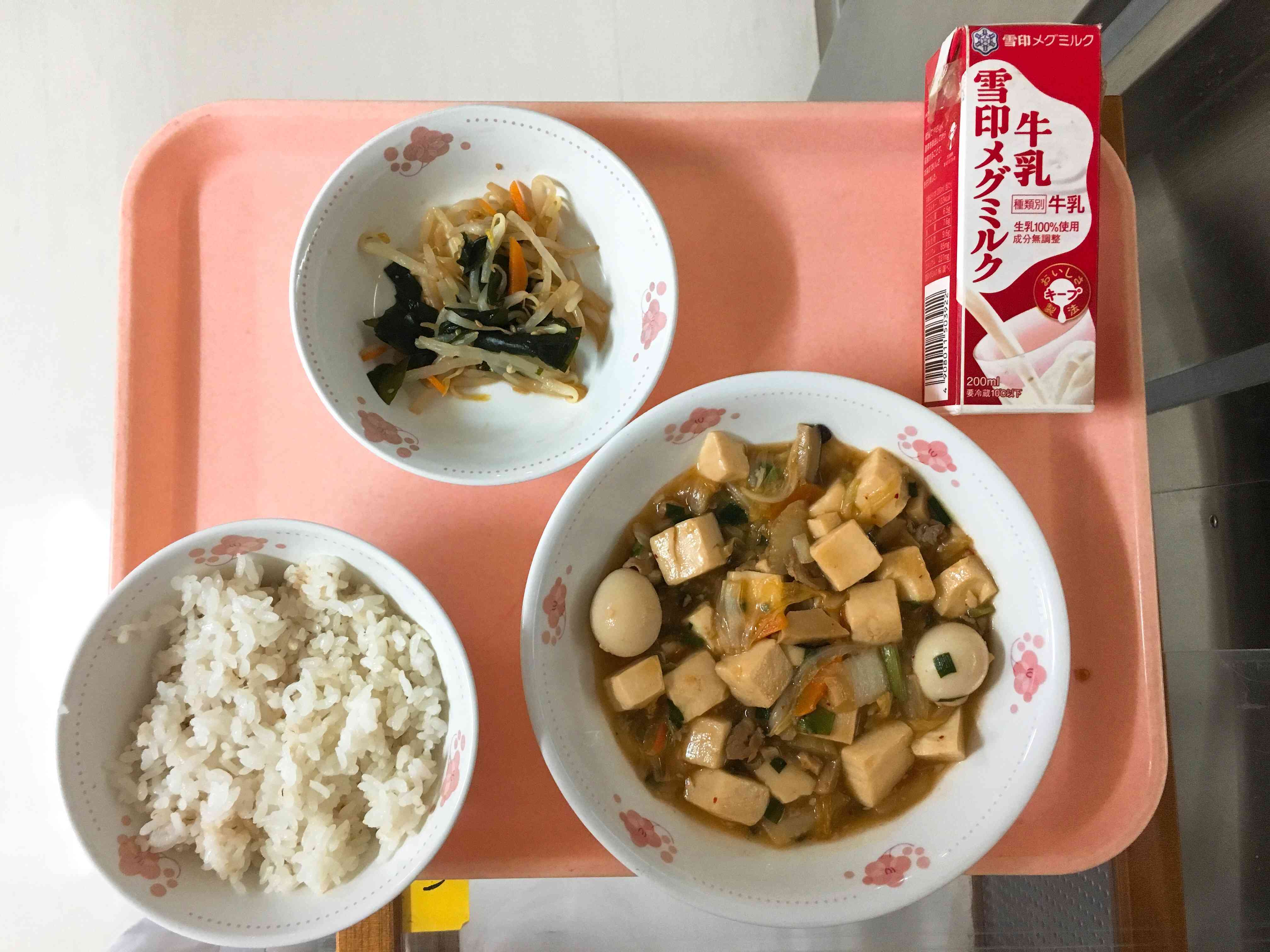 ごはん、豚キムチ豆腐、もやしとわかめのごま醤油