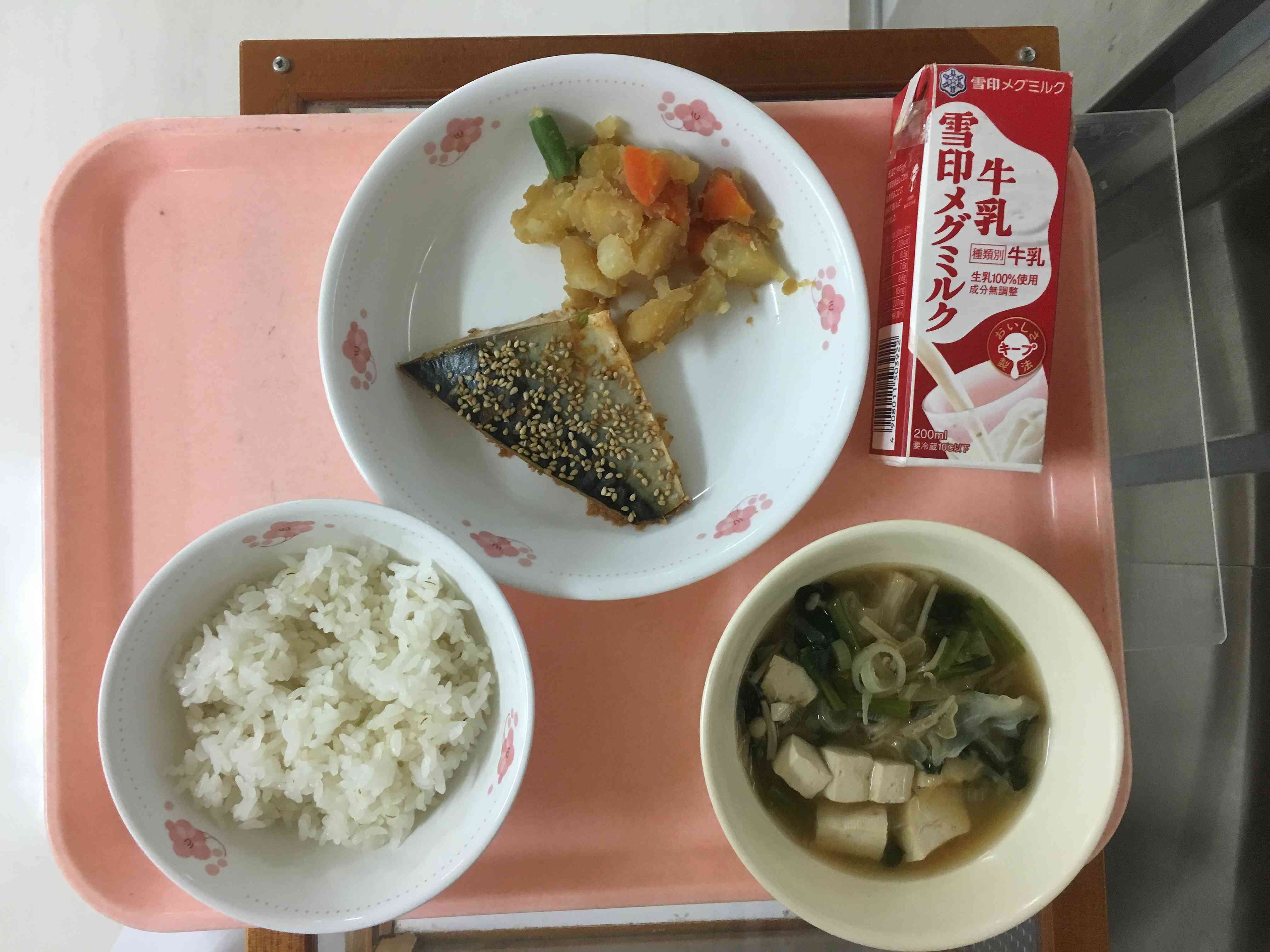 ごはん、さばのコチュジャン焼き、じゃがいもの煮物、豆腐とキャベツのみそ汁