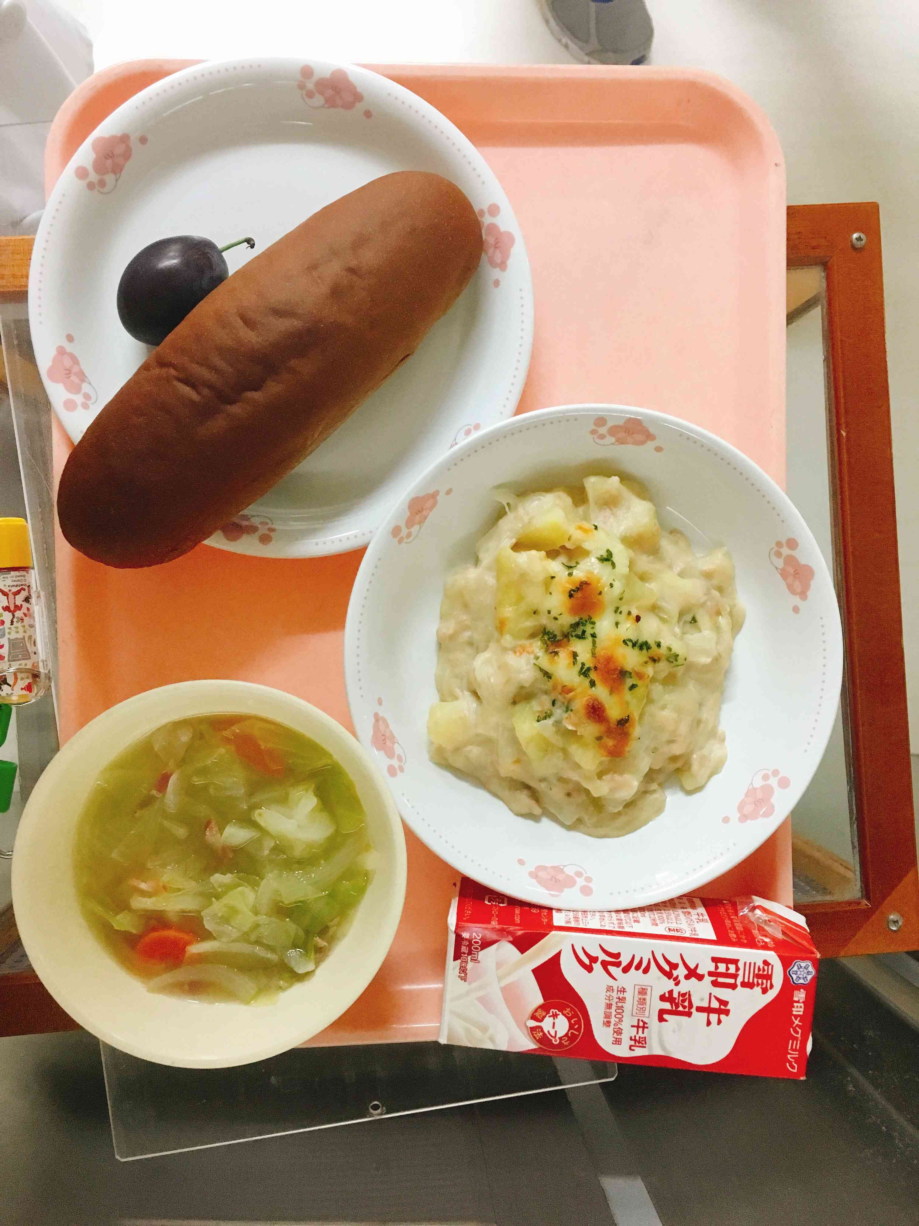 ココアパン、ツナとじゃがいものグラタン、野菜スープ、プルーン