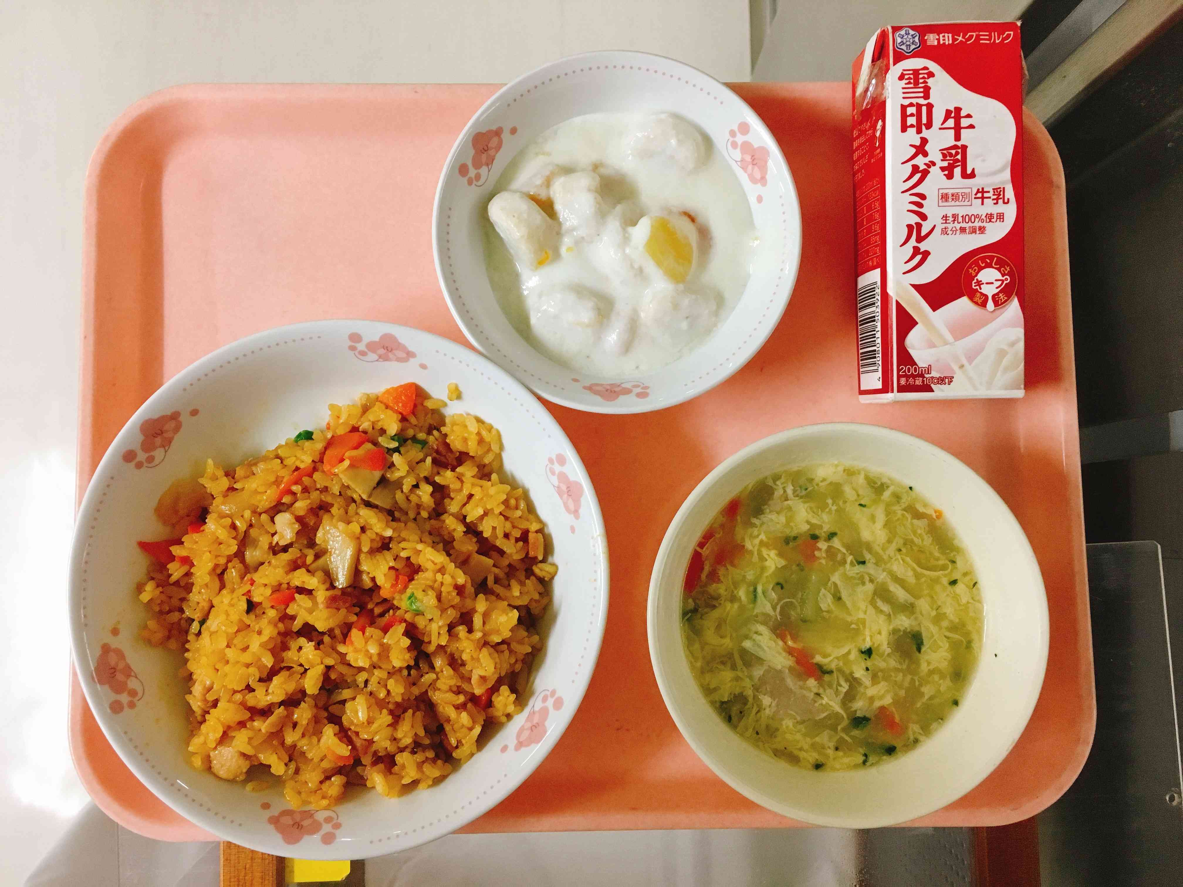 チキンライス、たまご入りコーンスープ、フルーツヨーグルト
