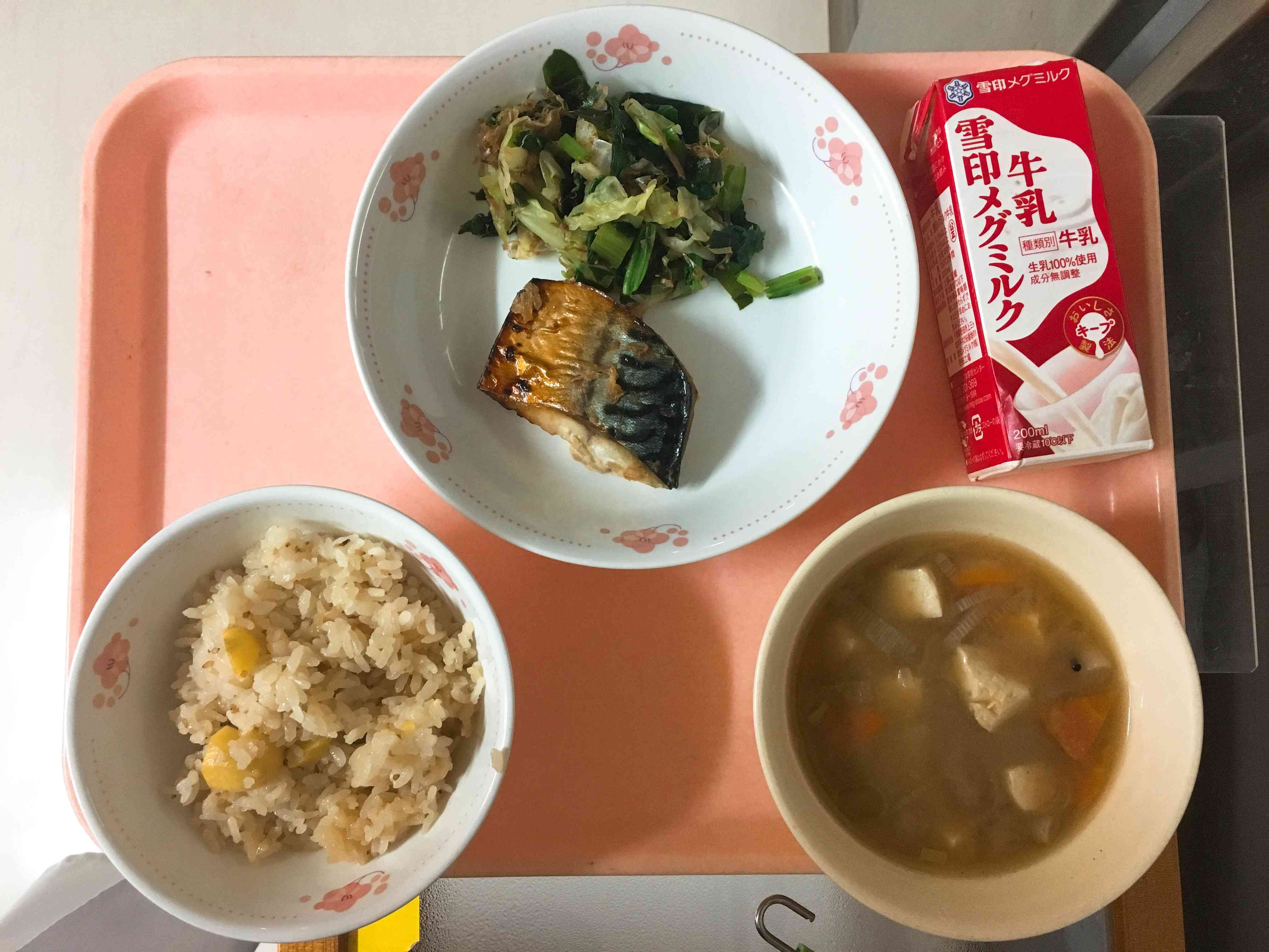 栗ごはん、さばのしょうが焼き、おかか和え、具沢山みそ汁