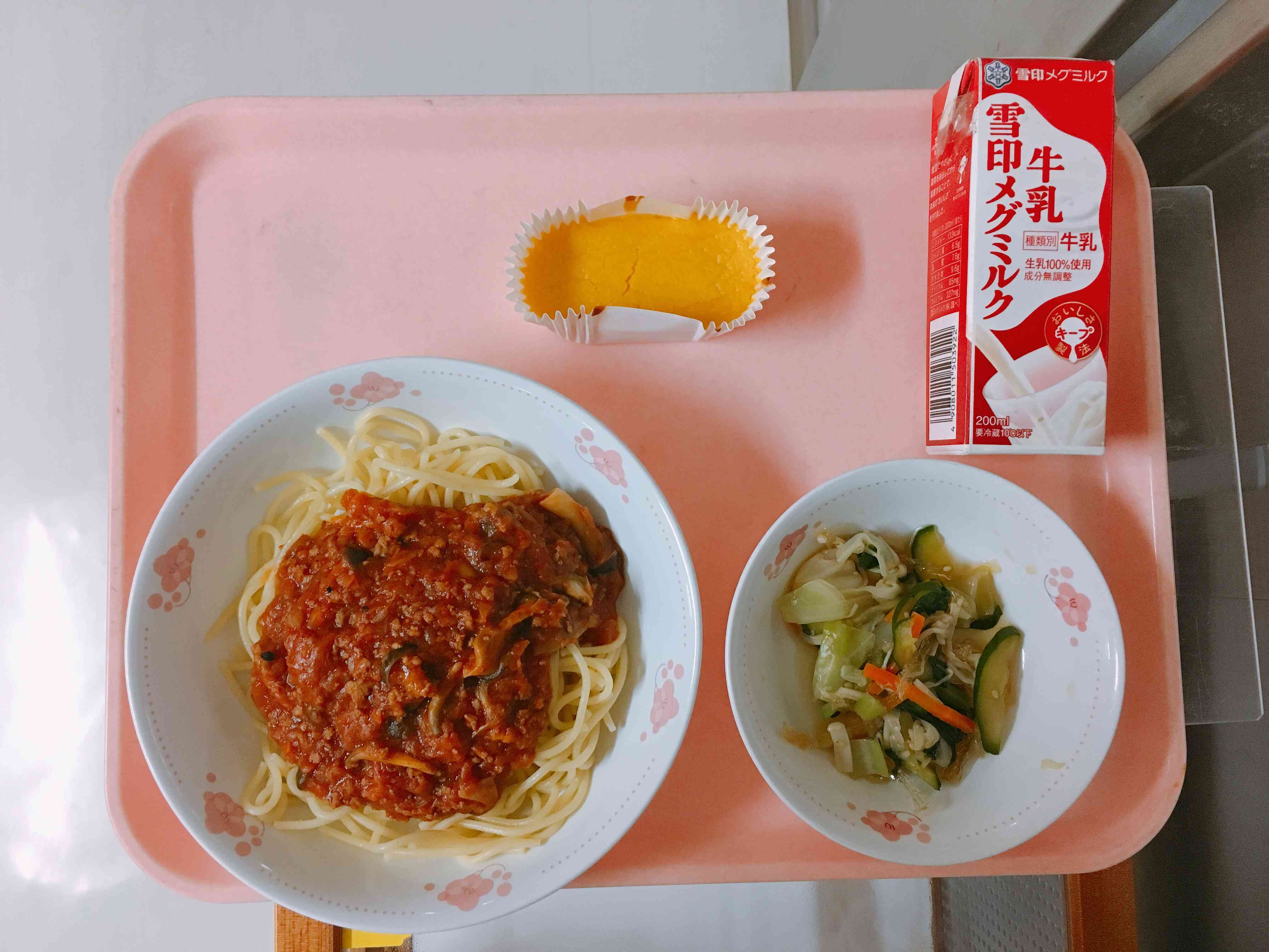 きのこ入りミートソーススパゲッティー、糸寒天サラダ、かぼちゃのチーズケーキ