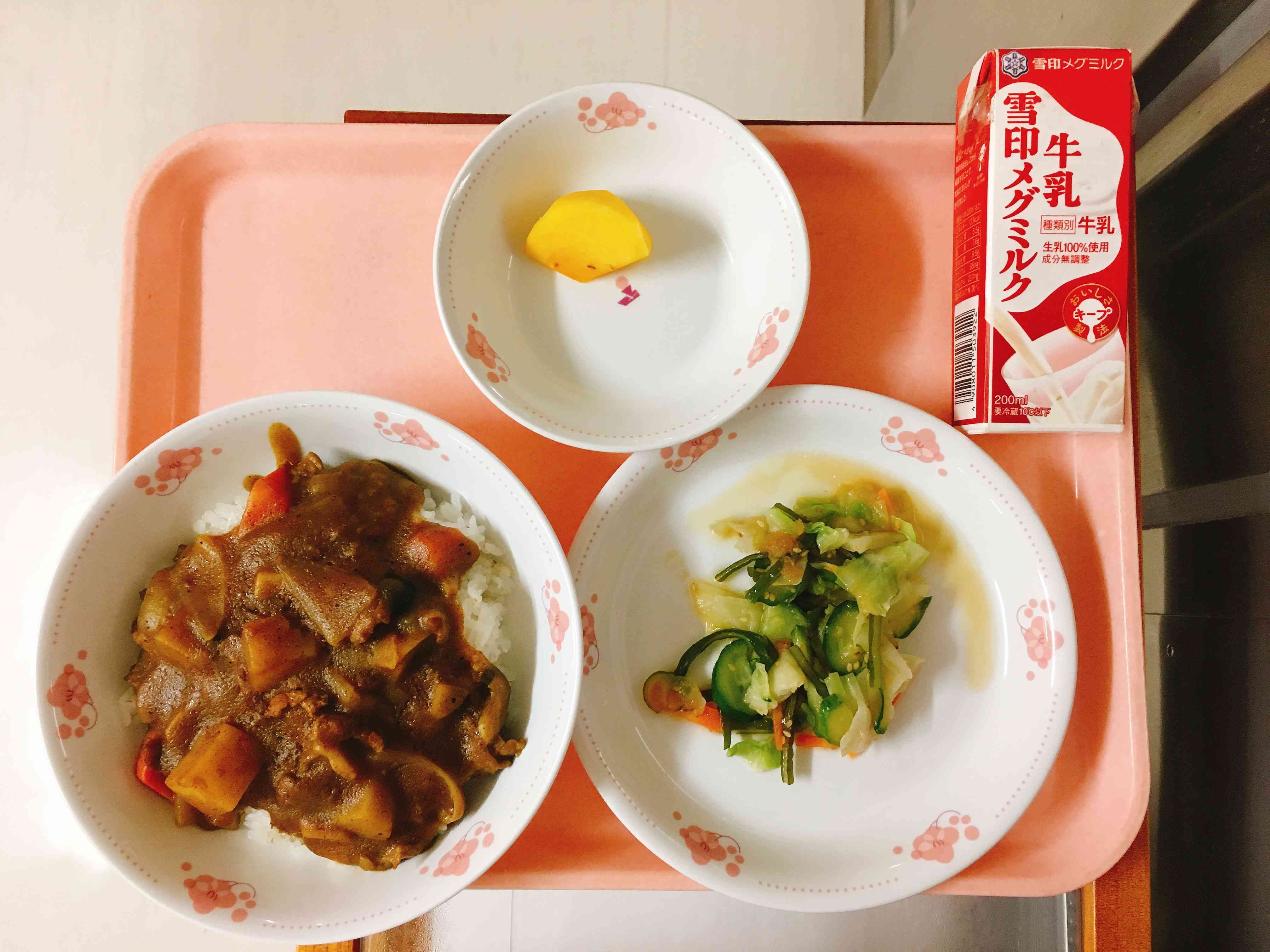 秋野菜のカレーライス、海藻入りサラダ、柿