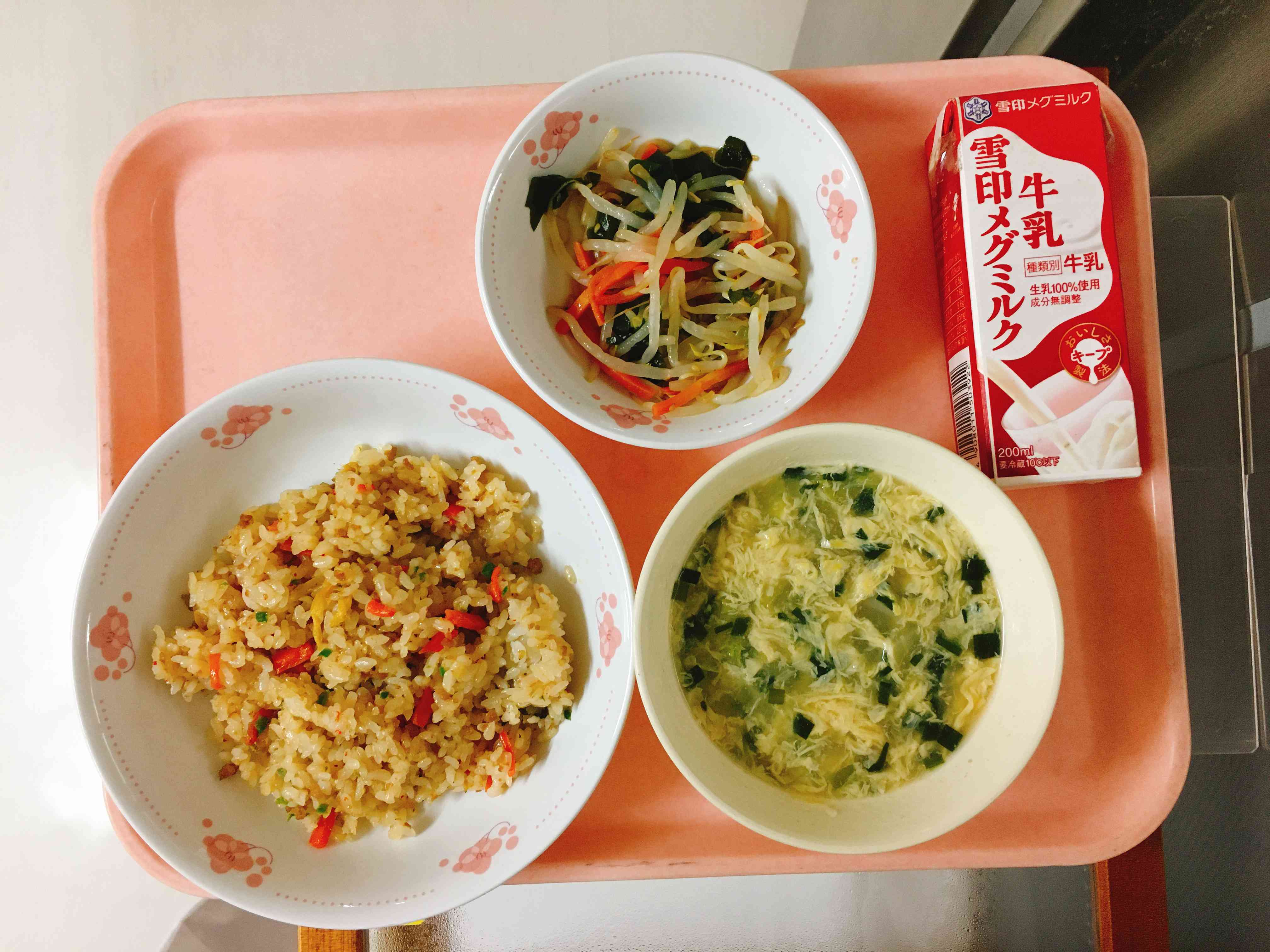 キムチ炒飯、もやしとわかめのごま醤油、にらたまスープ