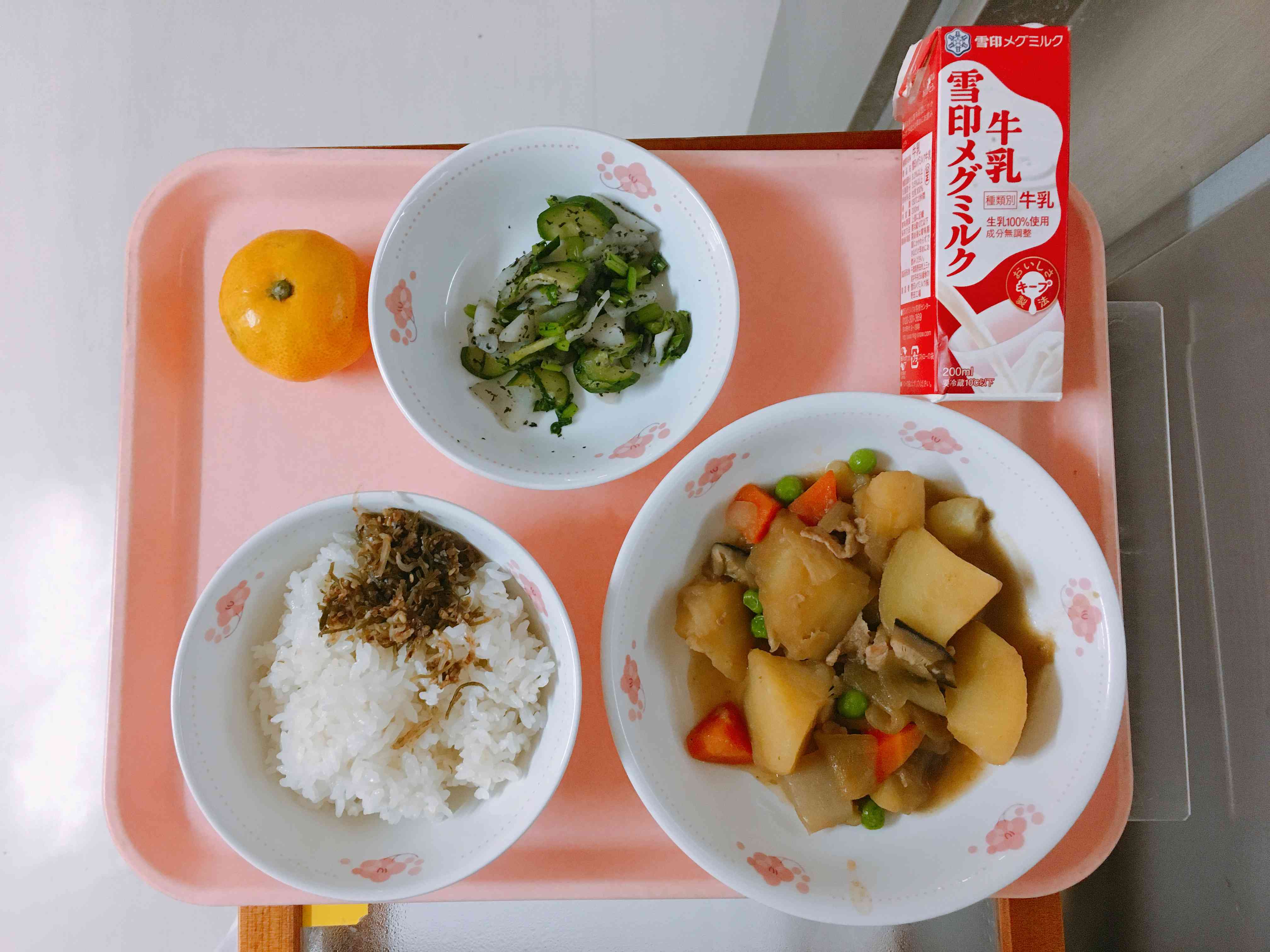 ごはん、かみかみ佃煮、肉じゃが、かぶときゅうりのゆかり風味、みかん
