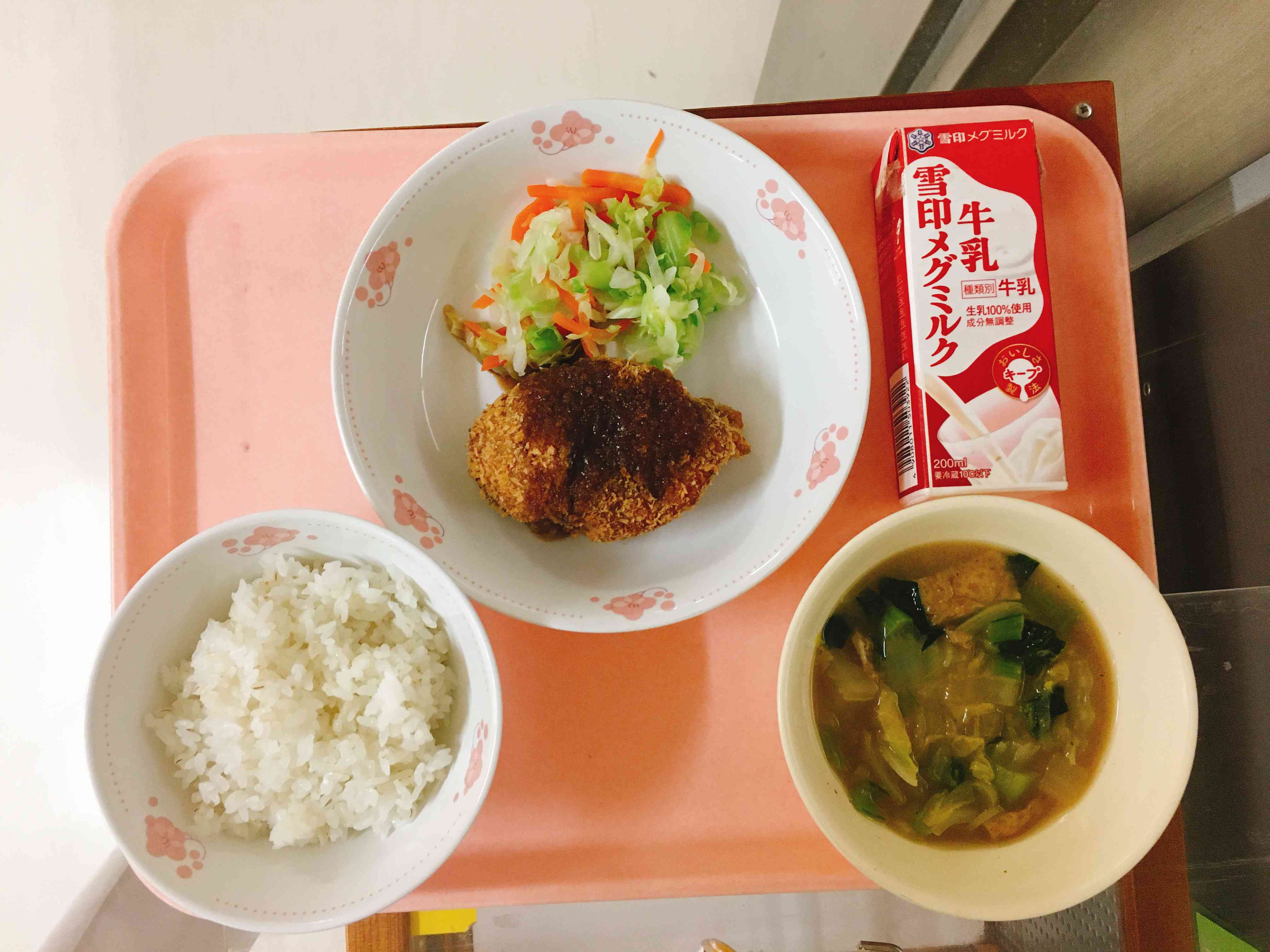 ごはん、コロッケ、ゆでキャベツ、白菜と油揚げのみそ汁