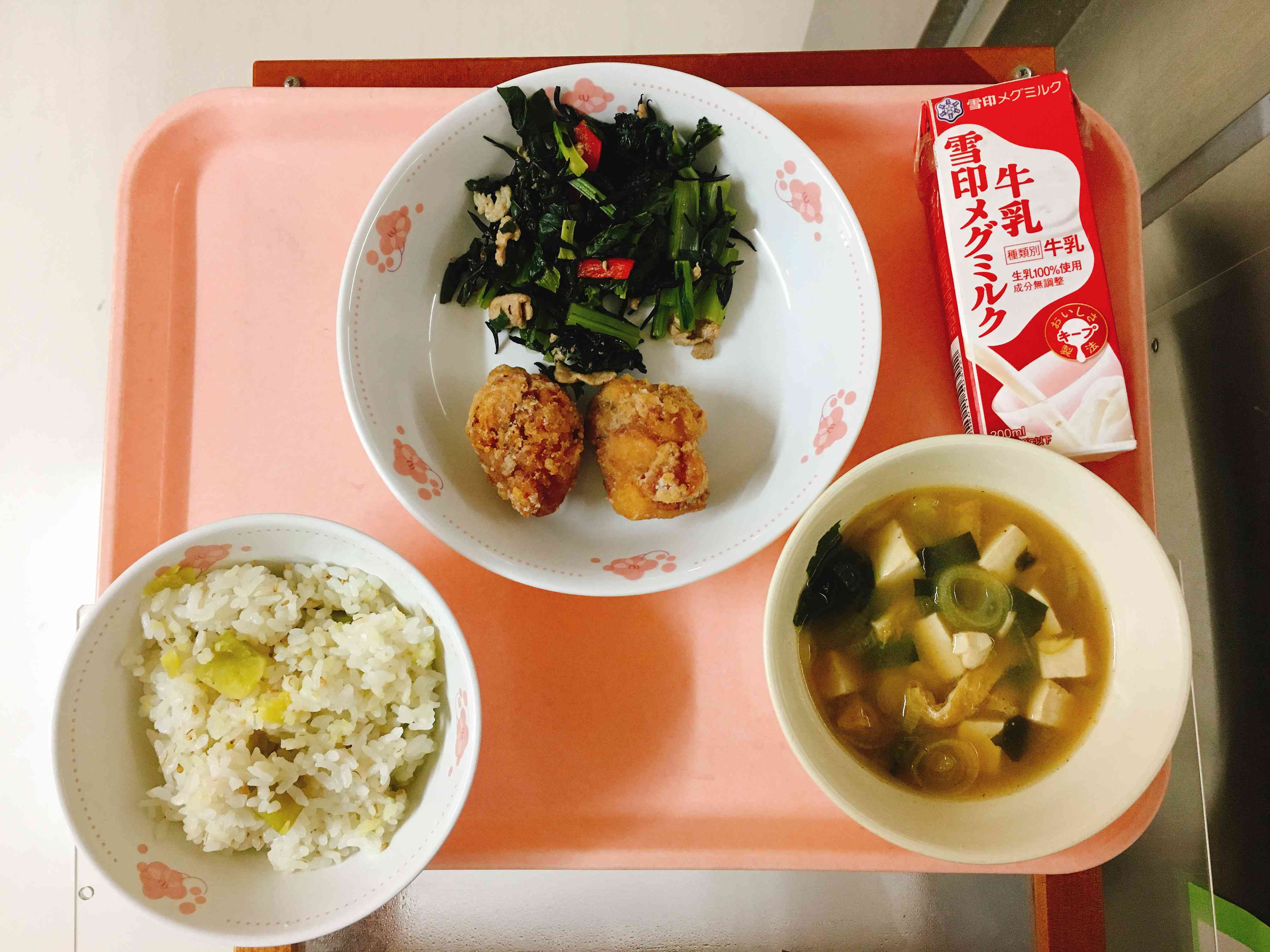 さつまいもごはん、鶏肉の唐揚げ、江戸菜と豚肉の煮浸し、豆腐とわかめのみそ汁