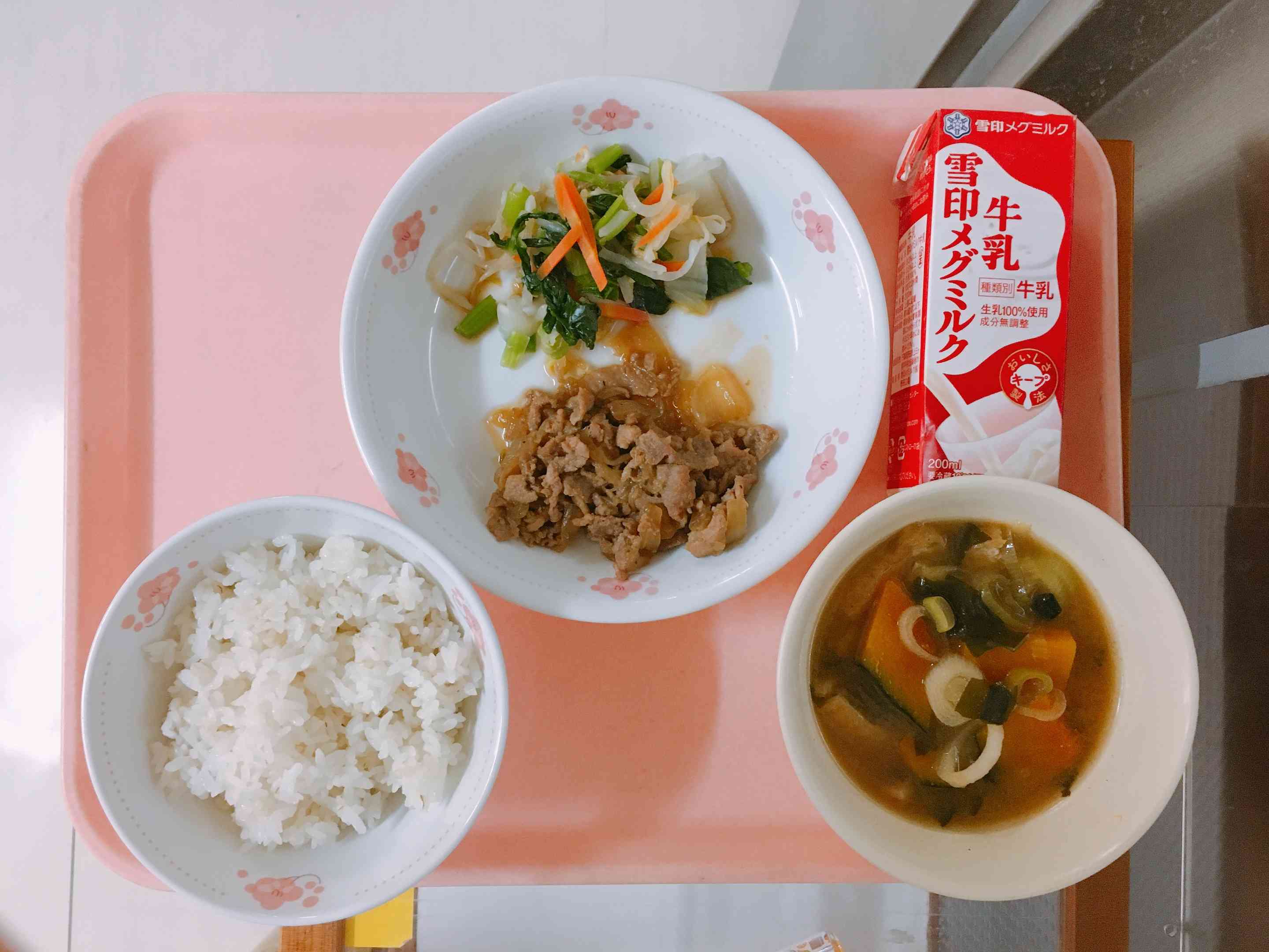 ごはん、豚肉のしょうが焼き、おひたし(辛子醤油)、かぼちゃのみそ汁