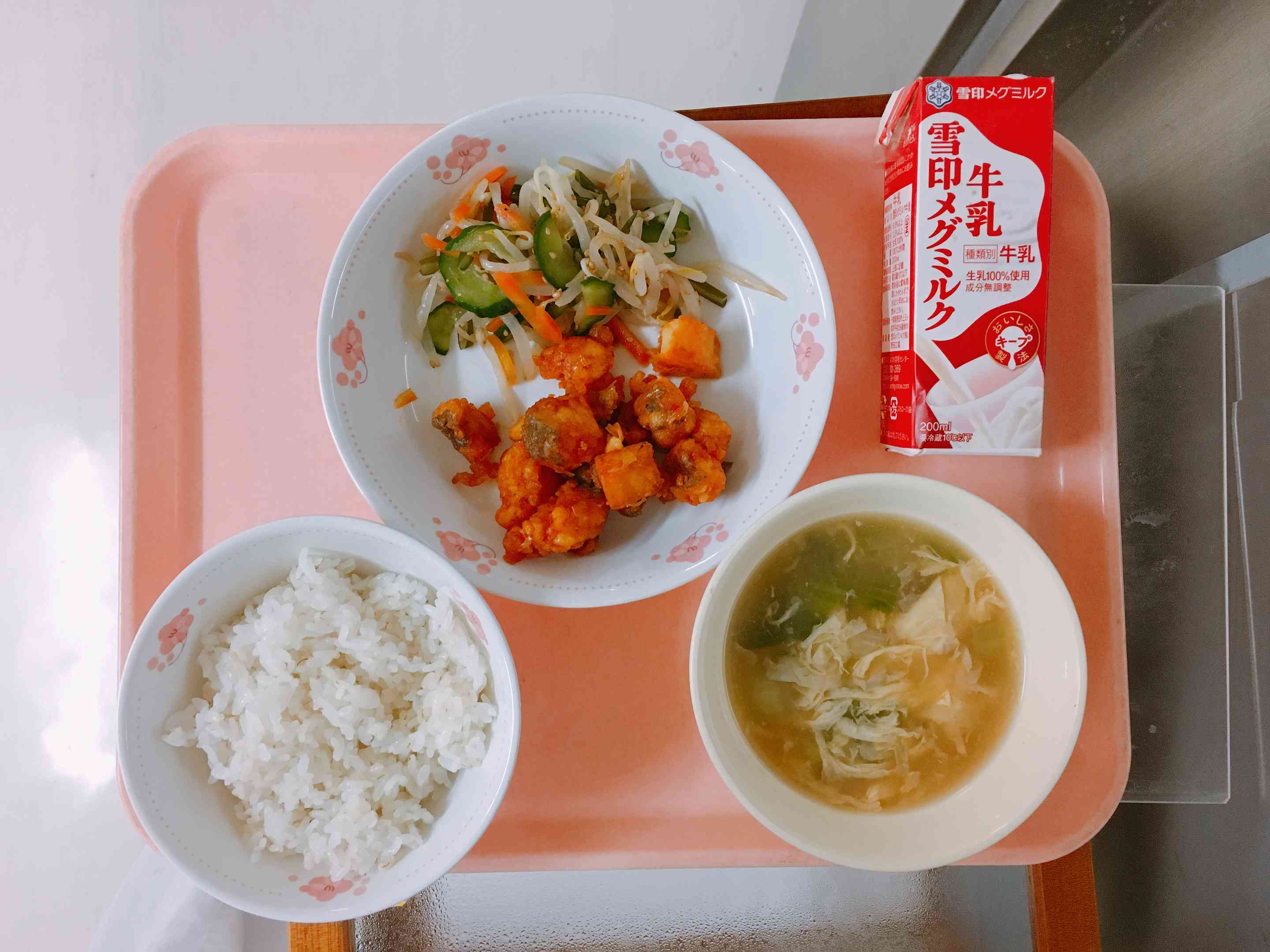 ごはん、魚とじゃがいものチリソース、青菜とコーンのたまごスープ、もやしの和え物