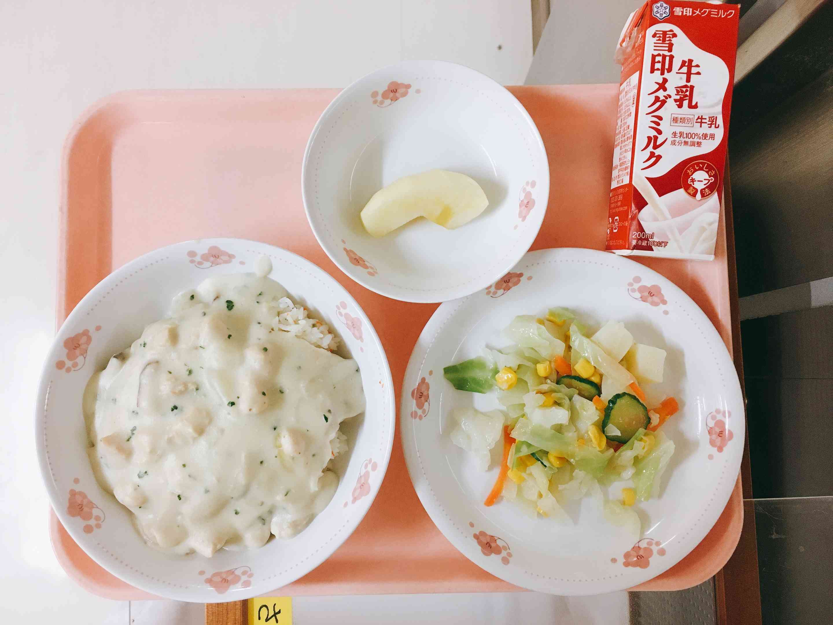 ピラフのホワイトソースかけ、じゃがいも入りサラダ、りんご