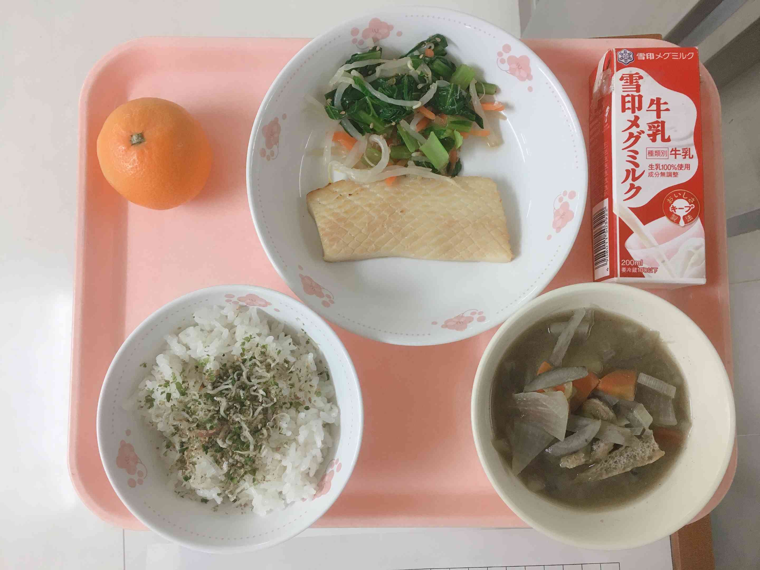 じゃこふりかけごはん、いかの照り焼き、おひたし(ごま酢)、具沢山みそ汁、みかん