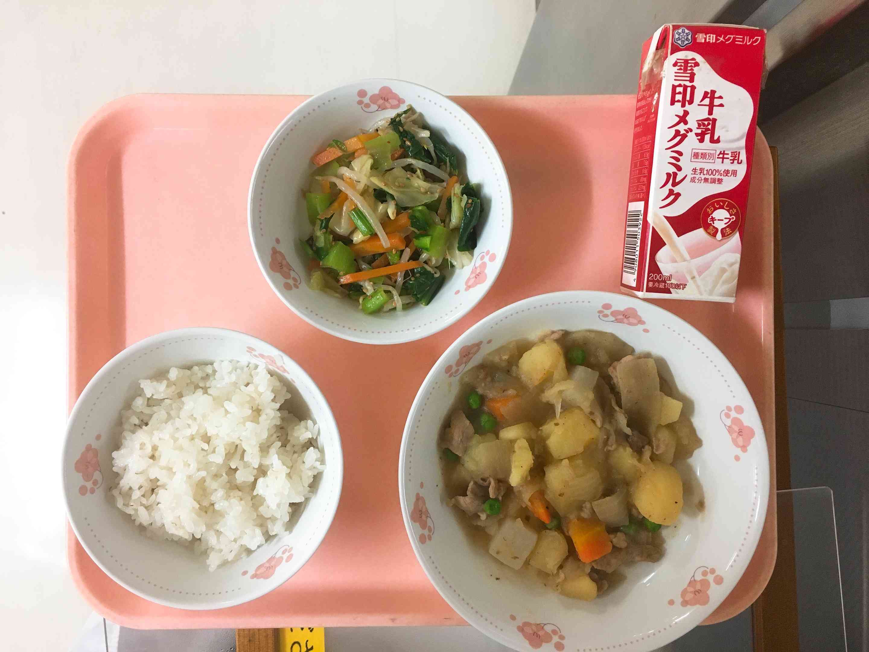 ごはん、塩麹肉じゃが、小松菜の和え物