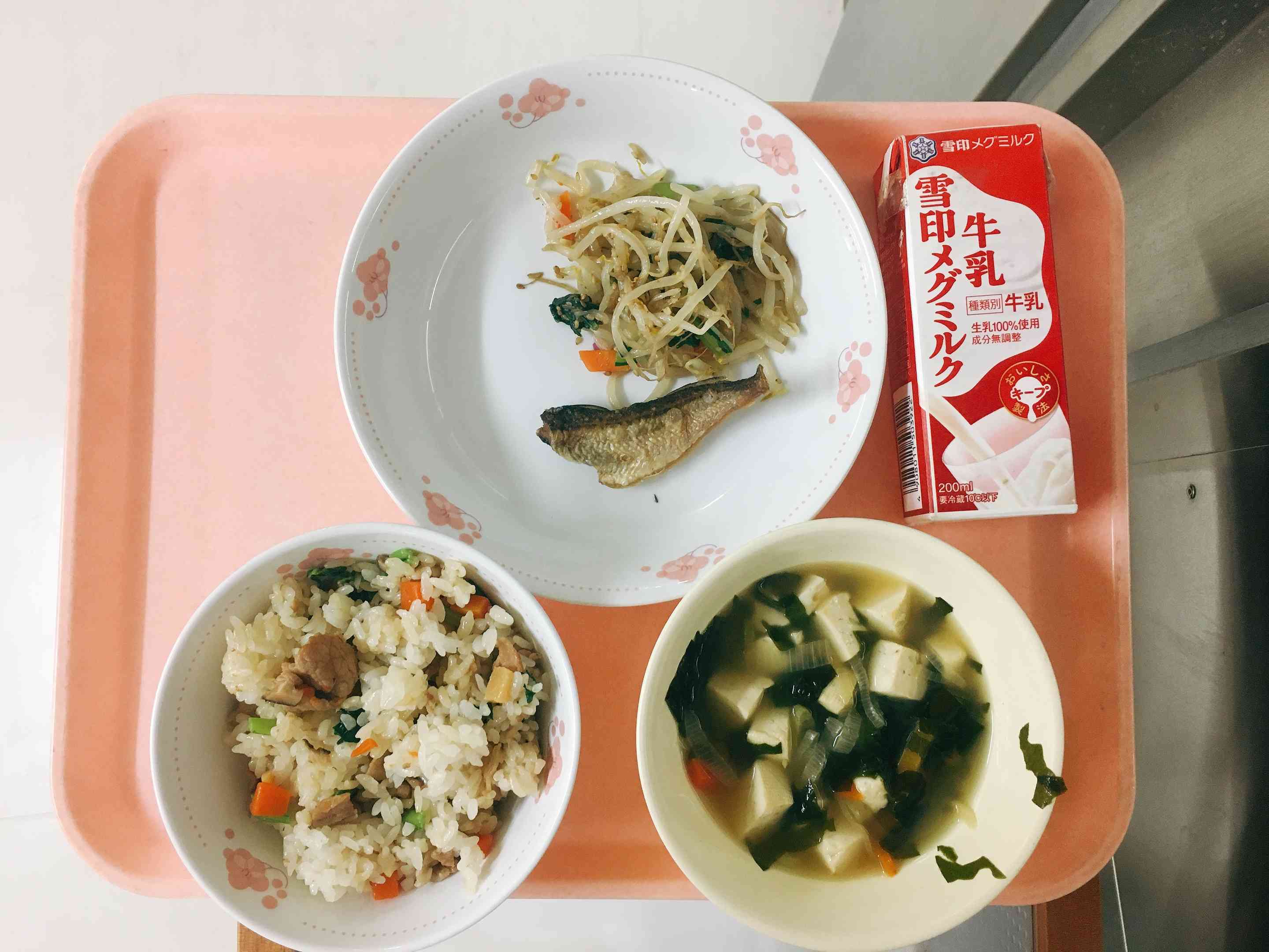 中華風五目炊き込みごはん、はたはたの唐揚げ、ナムル、わかめスープ