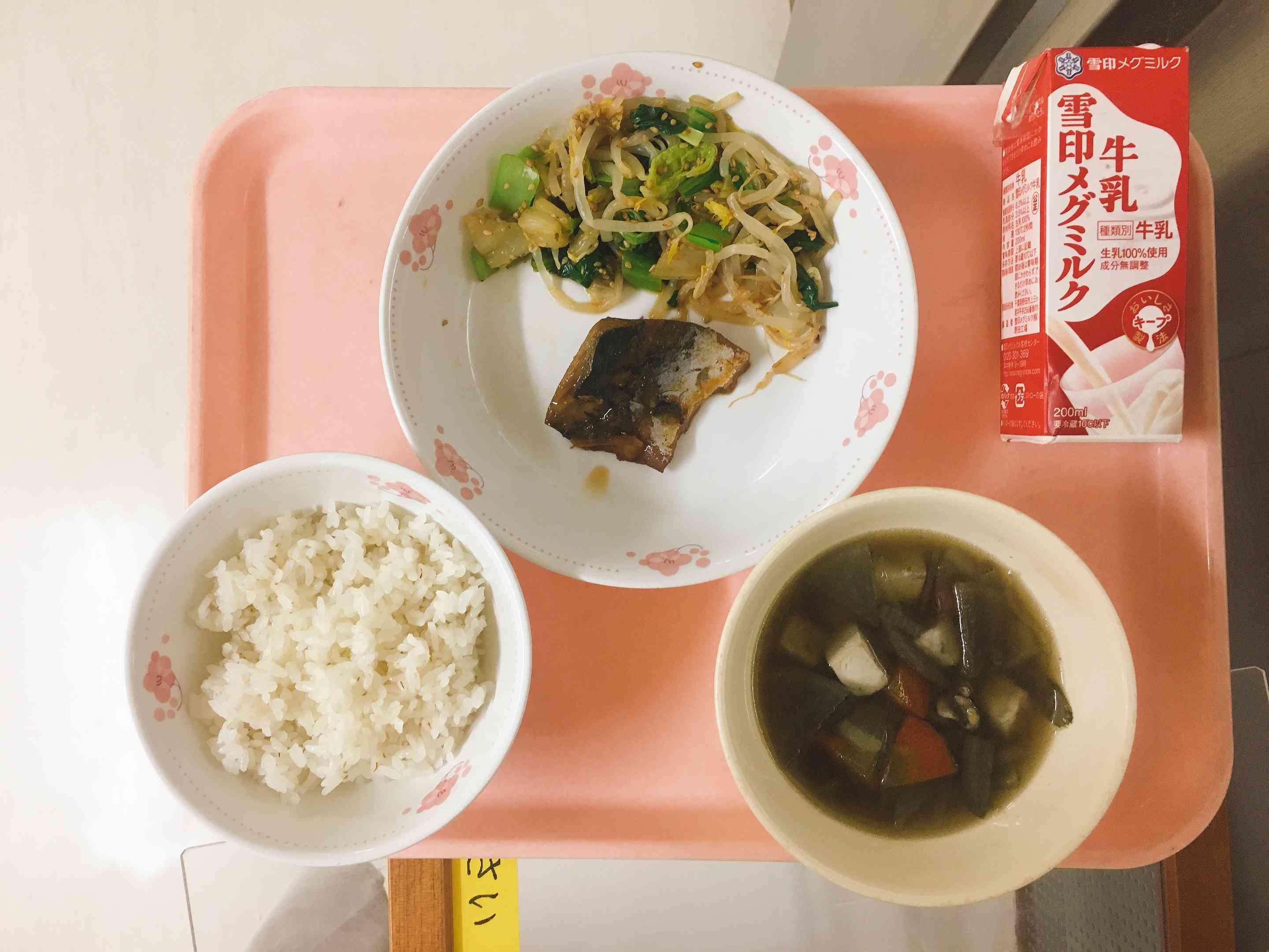ごはん、さばのみそ煮、おひたし(ごまかけ)、けんちん汁
