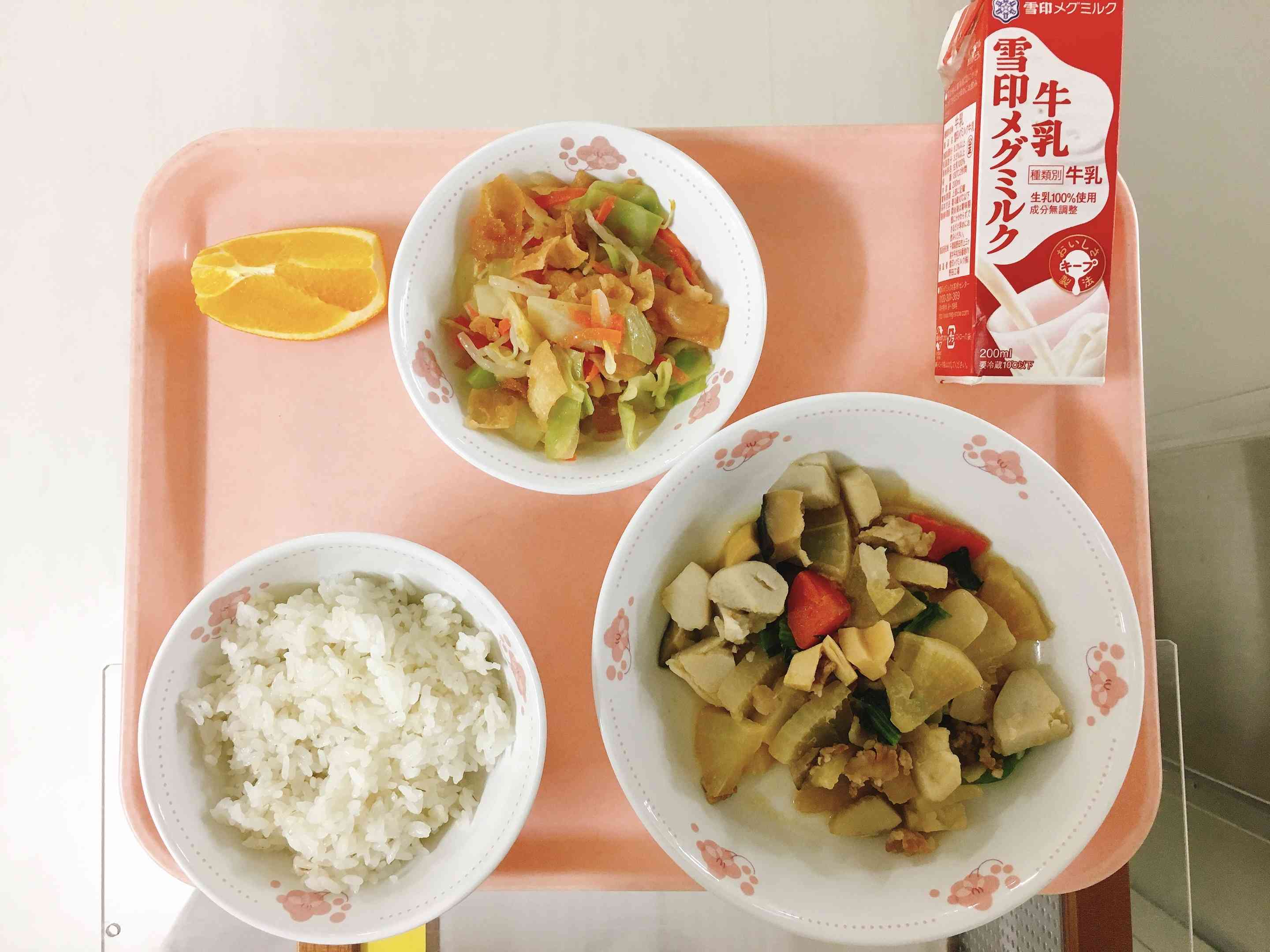 ごはん、大根と豚肉のべっこう煮、パリパリサラダ、ネーブル