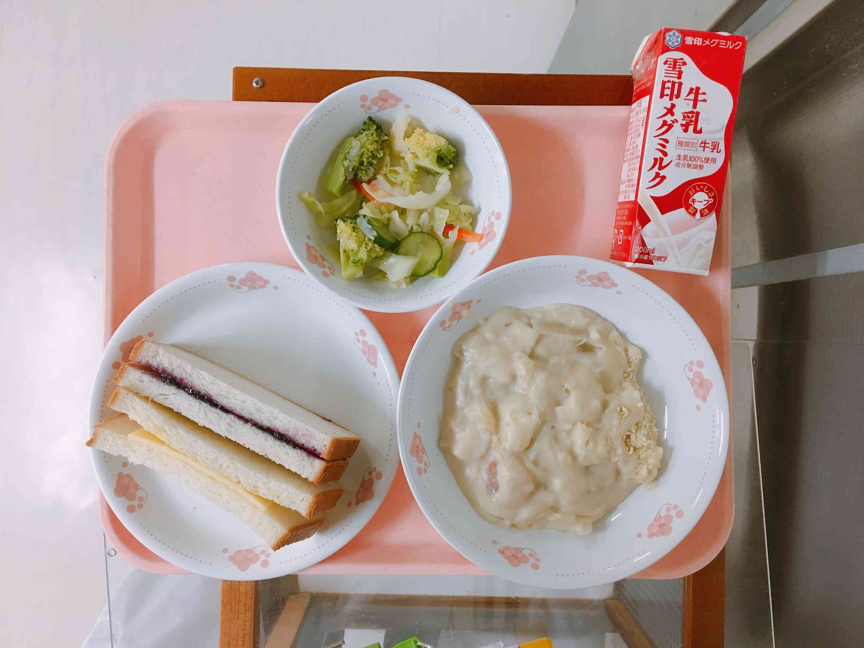 ジャムサンド、チーズサンド、シーフードグラタン、ブロッコリー入りサラダ