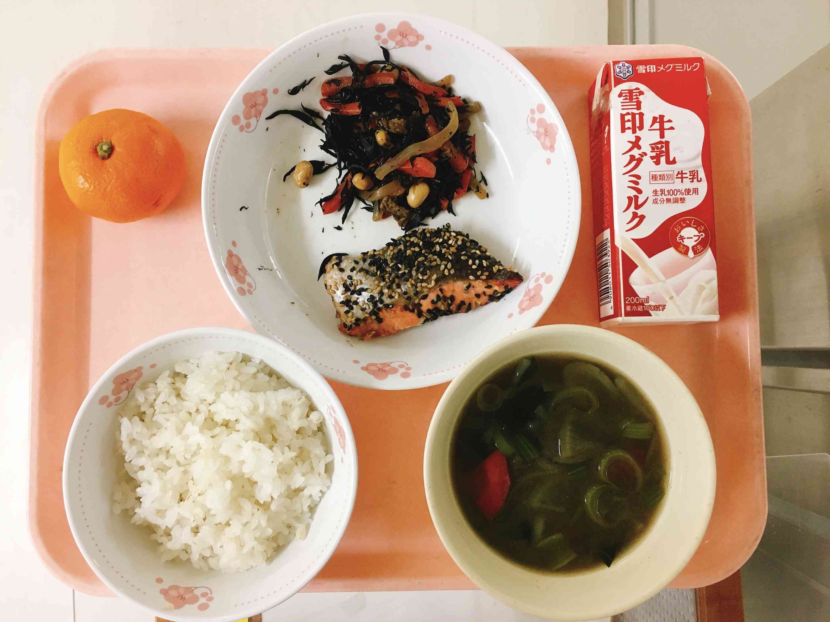 ごはん、鮭の南部焼き、ひじきと大豆の炒め煮、具だくさんみそ汁、みかん