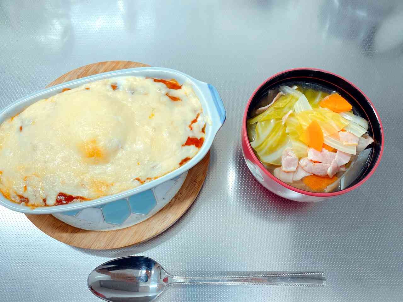 こんにちは。栄養士の今井佳澄です。 休校期間も3か月目に入りまして、1日3回の食事作りに苦労されてることと思います。 そこで献立作成のヒントになればと思い、ほぼリアルな栄養士のお昼ごはんを紹介します。できそうなメニューならお昼ごはんに採用していただき、採用できなくてもおいしそうだなと思っていただけるだけでも嬉しいです。保護者の皆様の食事作りに少しでも役に立てば幸いです。 ☆今日のメニュー☆ ・なんちゃってミラノ風ドリア ・コンソメスープ 材料 ・なんちゃってミラノ風ドリア ごはん 1人分 バター 10g サラダ油 5g 小麦粉 大さじ1 牛乳 適量 ミートソース 適量 卵 1個 チーズ 好きなだけ ・コンソメスープ コンソメ 1/2個 ベーコン 2枚 野菜(キャベツ、たまねぎ、にんじん) 100gくらい 作り方 ・なんちゃってミラノ風ドリア (1)ホワイトソースを作る。(市販のものを使ったり、無しでもOK) バターとサラダ油、小麦粉を耐熱皿に入れて20秒加熱する。 取り出して、よく混ぜる。さらに20秒加熱する。 取り出して、牛乳を少しずつ加えて混ぜる。(ダマになるが、気にしない。) もう一度20秒加熱し、トロトロになるまで牛乳を加えてよく混ぜる。 (2)ごはんとホワイトソースを混ぜて、グラタン皿に詰める。 (3)(2)の上からミートソースをかける。真ん中をくぼませて卵を割り入れる。(半熟卵が好きな人は生の卵を、火が通ってる卵がいい人は温泉卵やゆで卵をのせる。) (4)チーズをかけて、トースターでチーズに焼き目がつくくらい加熱する。 ・コンソメスープ (1)ベーコンを炒める。 (2)水を加える。 (3)野菜とコンソメを加え、野菜が煮えるまで煮る。 (4)塩こしょうで味を整える。 ☆今日のポイント☆ 赤・黄・緑の仲間の食べ物を揃えるようにしましょう。 →ドリアに卵をのせたり、市販のミートソースにひき肉を追加したり、スープにベーコンやハムを入れたりしましょう。 ☆今日の写真☆ 1枚目:完成写真 2枚目:なんちゃってミラノ風ドリアの材料 3枚目:スープに入れた野菜。これで250gくらい(2人分)です。多かったです…【添付ファイル】