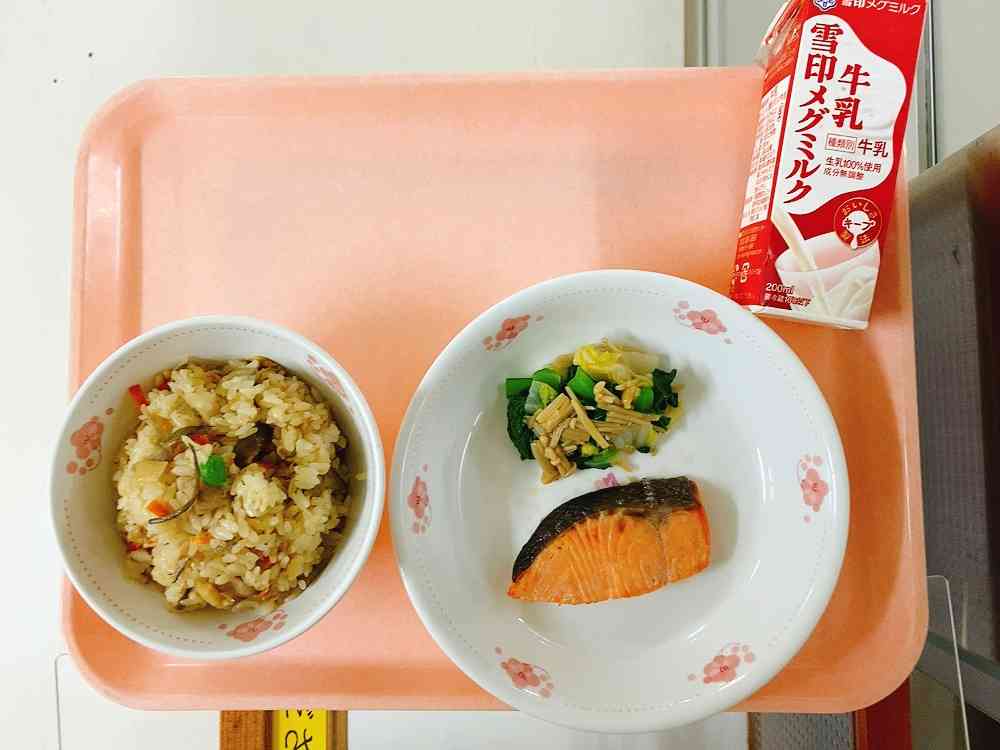 五目ごはん、鮭の塩焼き、なめたけ入りおひたし