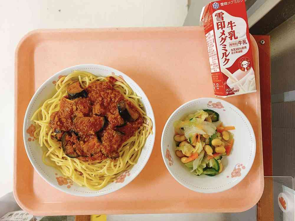 なす入りミートソーススパゲティー、大豆入りサラダ