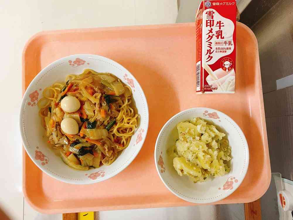 五目あんかけ焼きそば、じゃがいもの香味和え