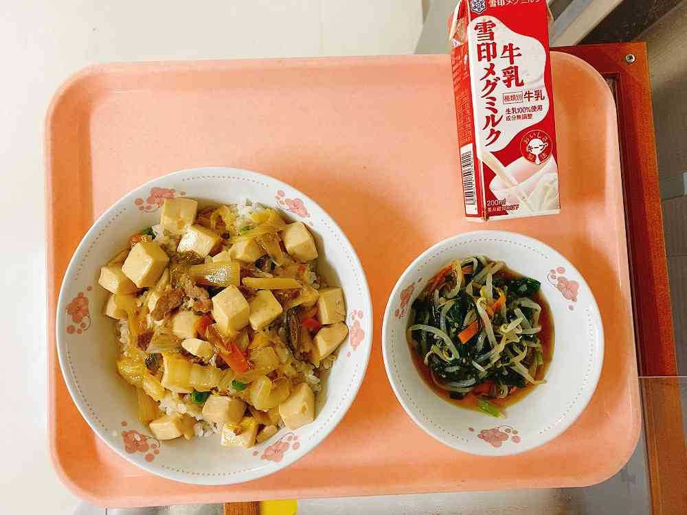豆腐の中華煮丼、もやしとわかめのごましょうゆ