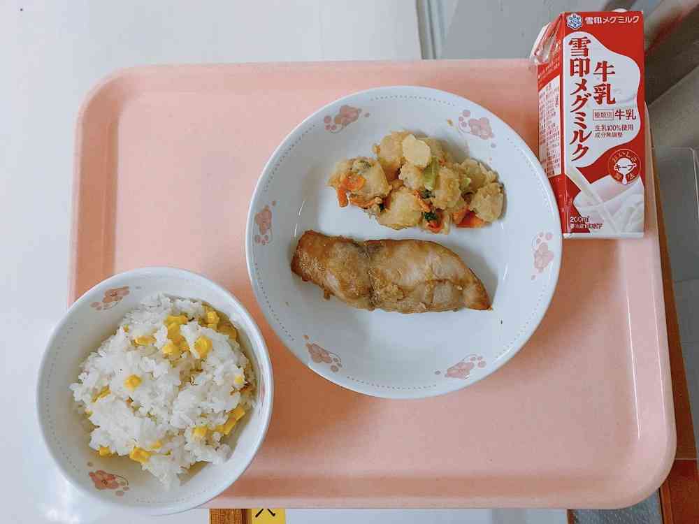 とうもろこしごはん、しいらの和風にんにくバター焼き、じゃがいもの練りゴマ和え