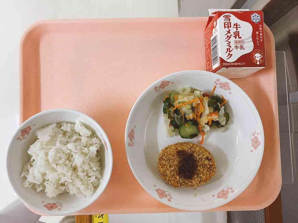 ごはん、ごまコロッケ、わかめ入りサラダ