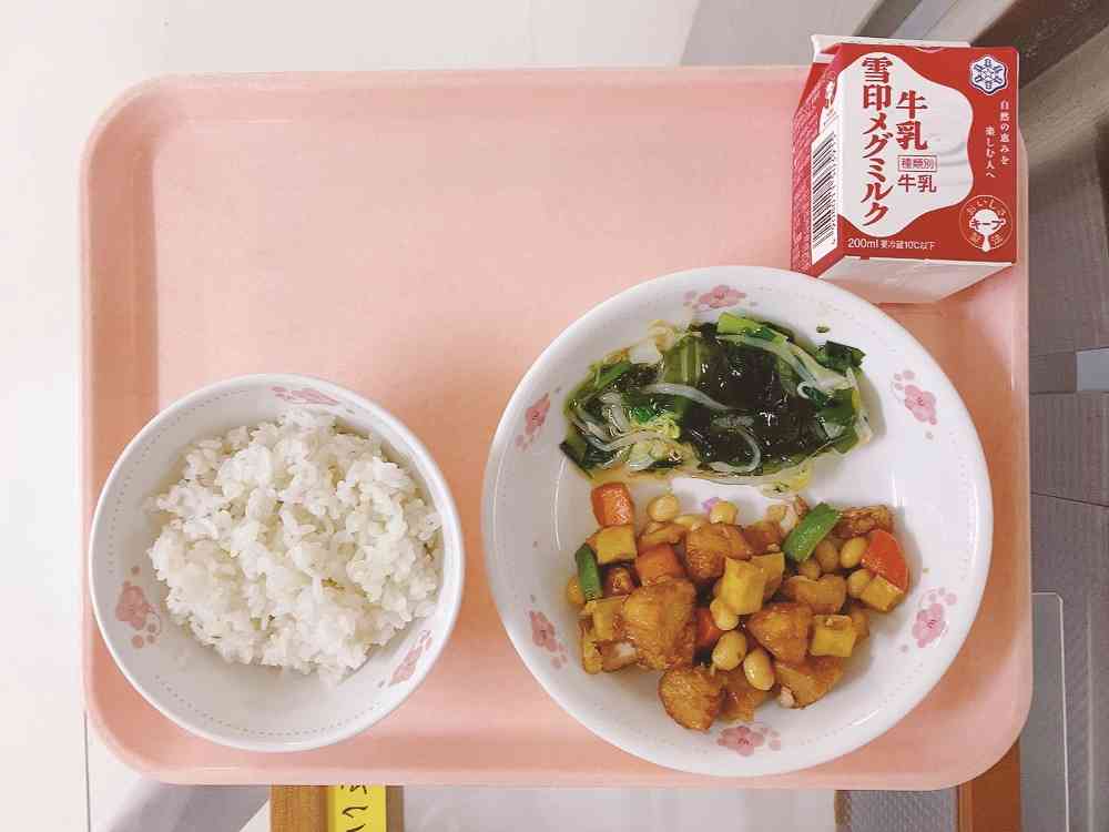 ごはん、魚と野菜の五色和え、わかめ入りおひたし